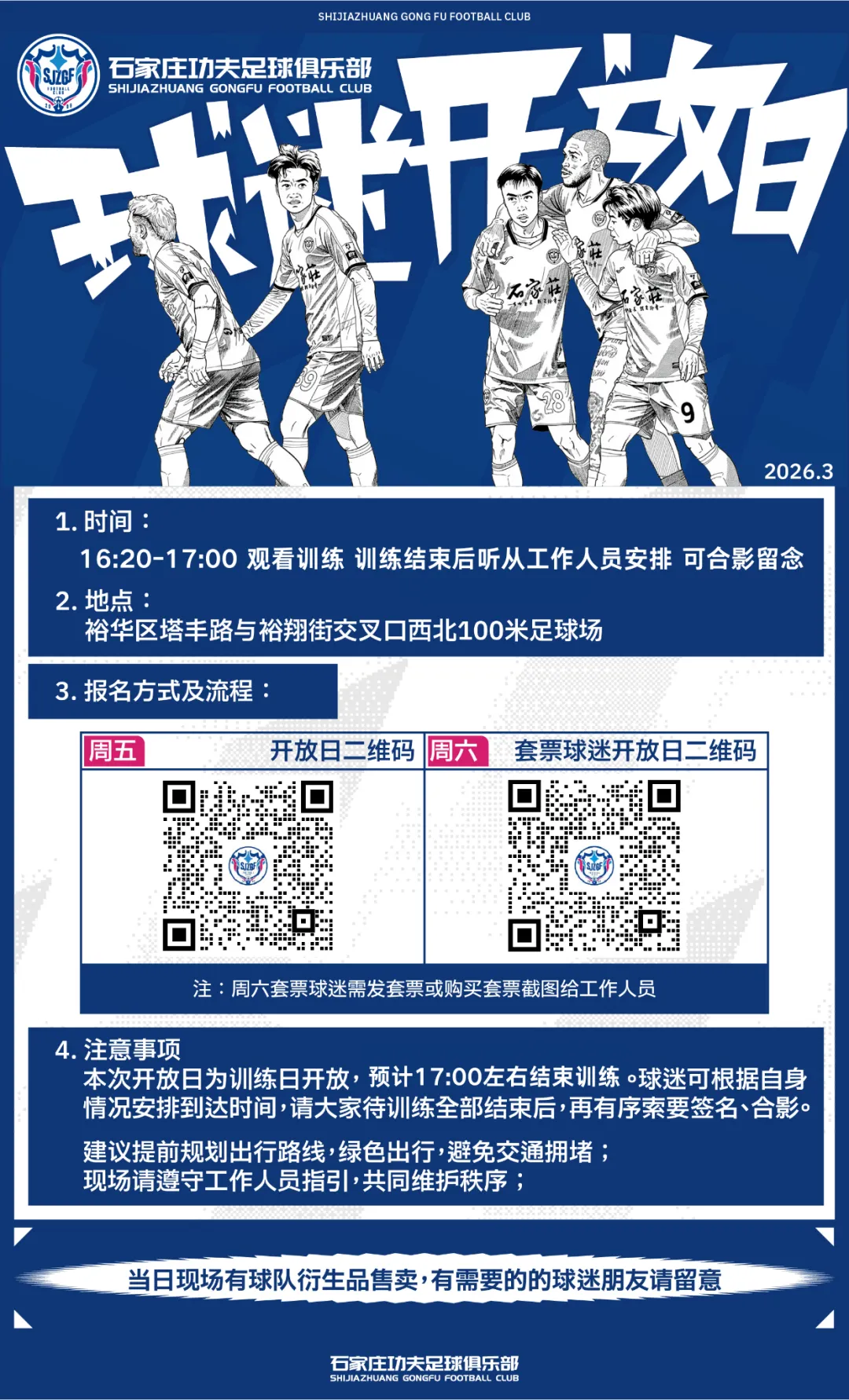 为回馈广大球迷长期以来的支持与厚爱,搭建球迷与球队近距离交流的桥梁,让球迷朋友们沉浸式感受球队训练氛围与团队精神,石家庄功夫足球俱乐部特举办球迷开放日活动。本次活动分为两个场次,周五下午为散客球迷专属开放日,周六下午为套票球迷专属开放日,诚邀各位球迷朋友莅临现场,共同为球队加油助威。