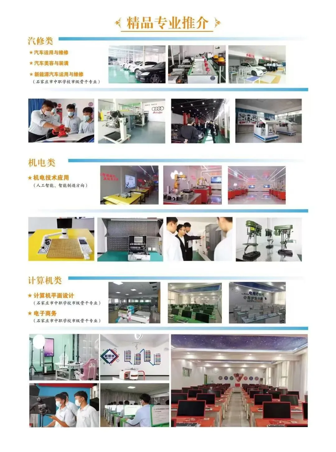 招生专业:汽修类(汽车运用与维修、汽车美容与装潢、新能源汽车运用与维修)、机电类(机电技术应用)、计算机类(计算机平面设计、电子商务)、形象设计类(美发与形象设计)、铁路类(铁道运输服务、电气化铁道供电)。