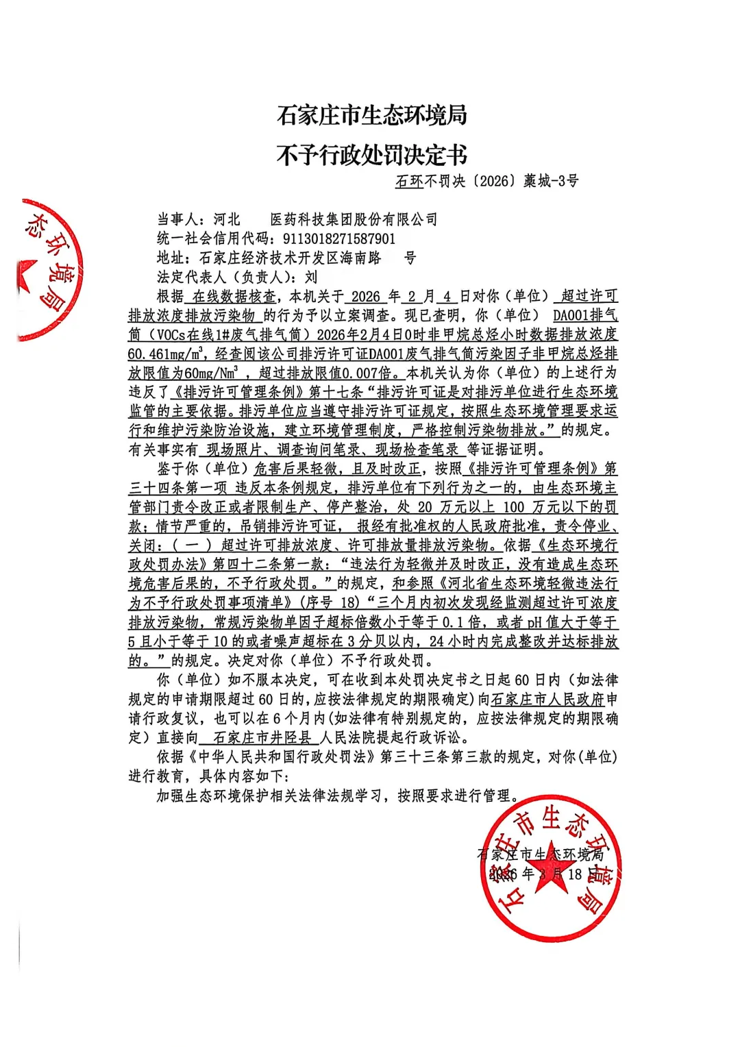 >河北石家庄某单位废气排放超过排放限值0.007倍不予处罚