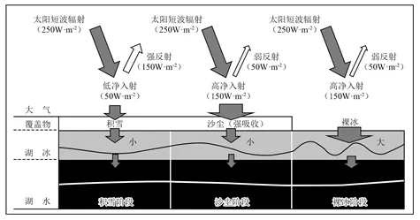 (3)与积雪和沙尘覆盖阶段相比,裸冰阶段湖冰温度日变化较大,请分析其作用机制。