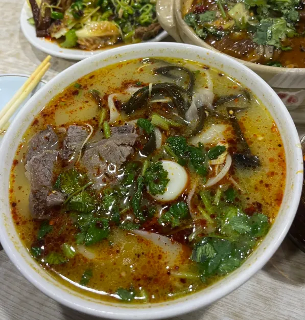 丛台烩面:劲道宽面条配肉丝和浓厚汤汁。老城区早餐铺最地道。