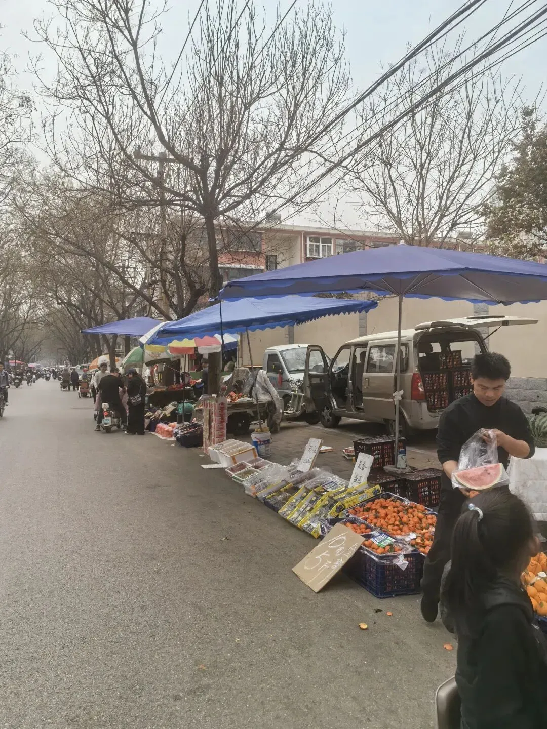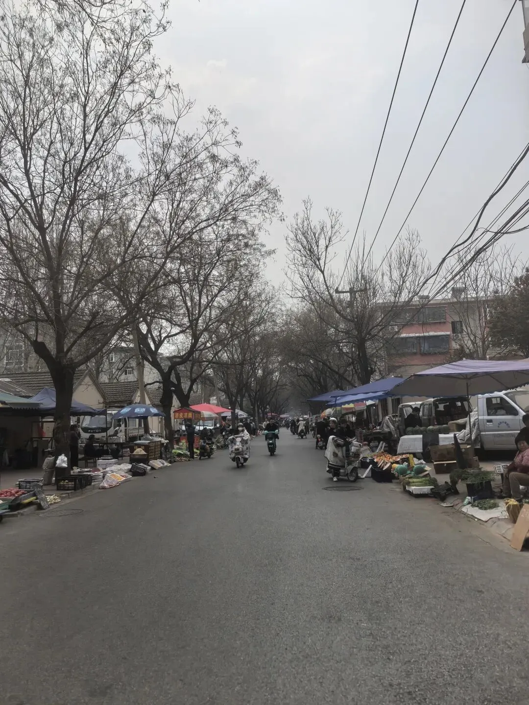 光秃的枝桠伸向灰白的天空,纵横的电线缠绕着日常的烟火,老旧的居民楼静静伫立,见证着一街一巷的变迁。没有刻意的修饰,只有最本真的生活模样——讨价还价的轻声、电动车的鸣笛、蔬果的清香,都成了最动人的旋律。
