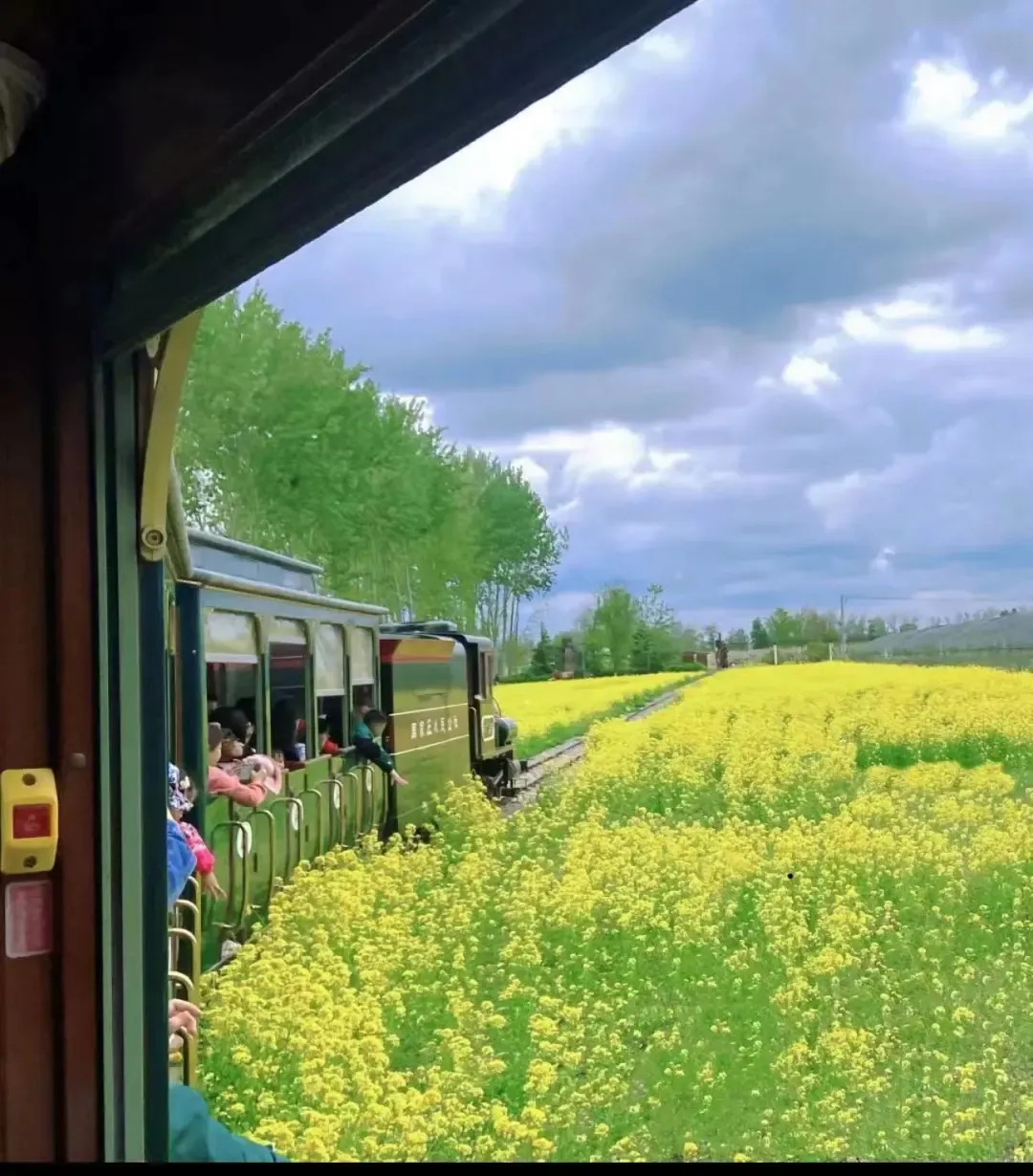 坐上观光小火车,穿越花海长廊!金黄油菜、粉艳桃花轮番映入眼帘,风拂过花瓣簌簌飘落,像下了一场温柔的花雨,治愈感拉满。