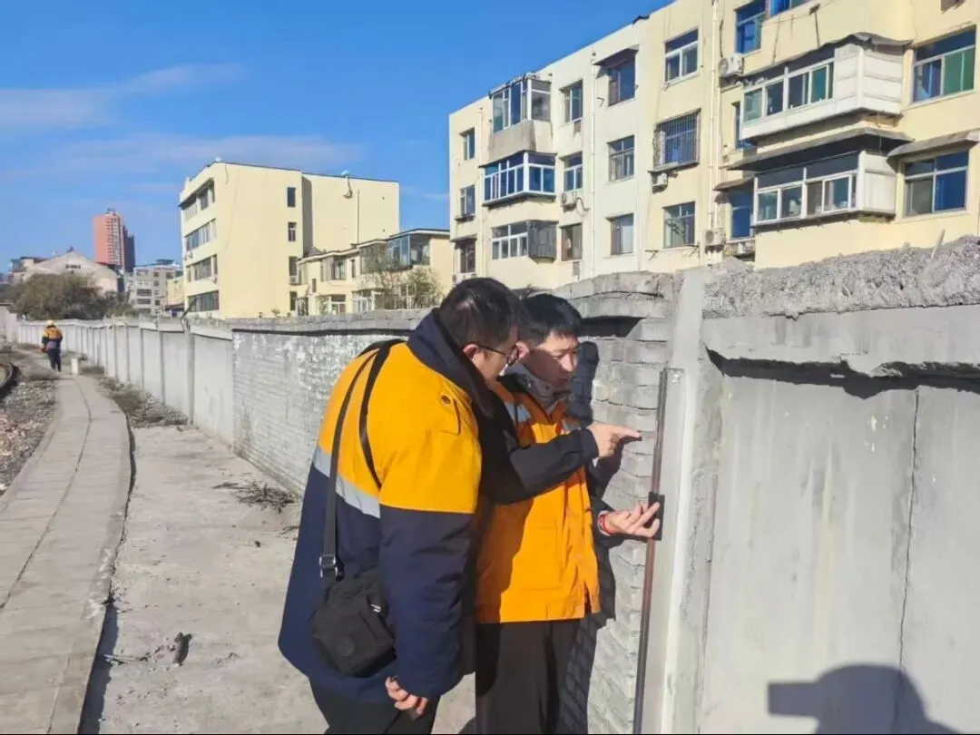 阳泉房建检修车间扎实推进春检工作,作业人员使用专业测量工具,重点排查墙体倾斜、基础沉降、裂缝风化等病害,并在裂缝区域做好标记,制定加固维修方案。(黄煜)
