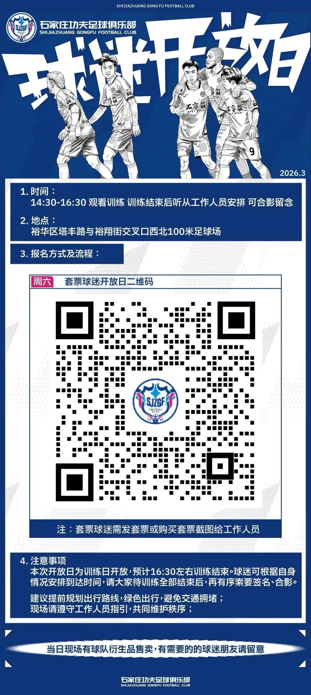 为回馈广大球迷长期以来的支持与厚爱,搭建球迷与球队近距离交流的桥梁,让球迷朋友们沉浸式感受球队训练氛围与团队精神,石家庄功夫足球俱乐部特举办球迷开放日活动。本次活动分为两个场次,周五下午开放日已圆满结束,周六下午为套票球迷专属开放日,诚邀各位球迷朋友莅临现场,共同为球队加油助威。