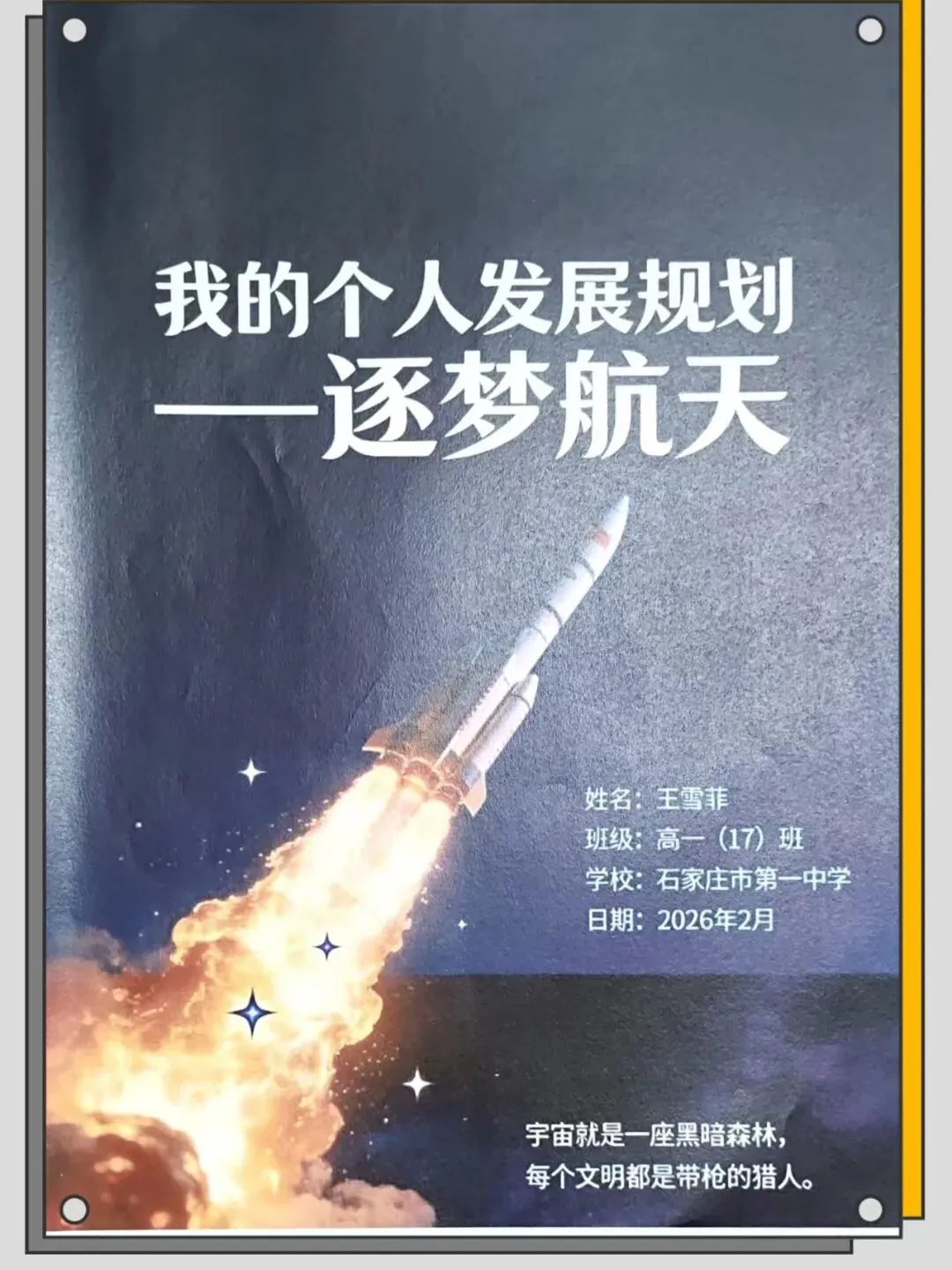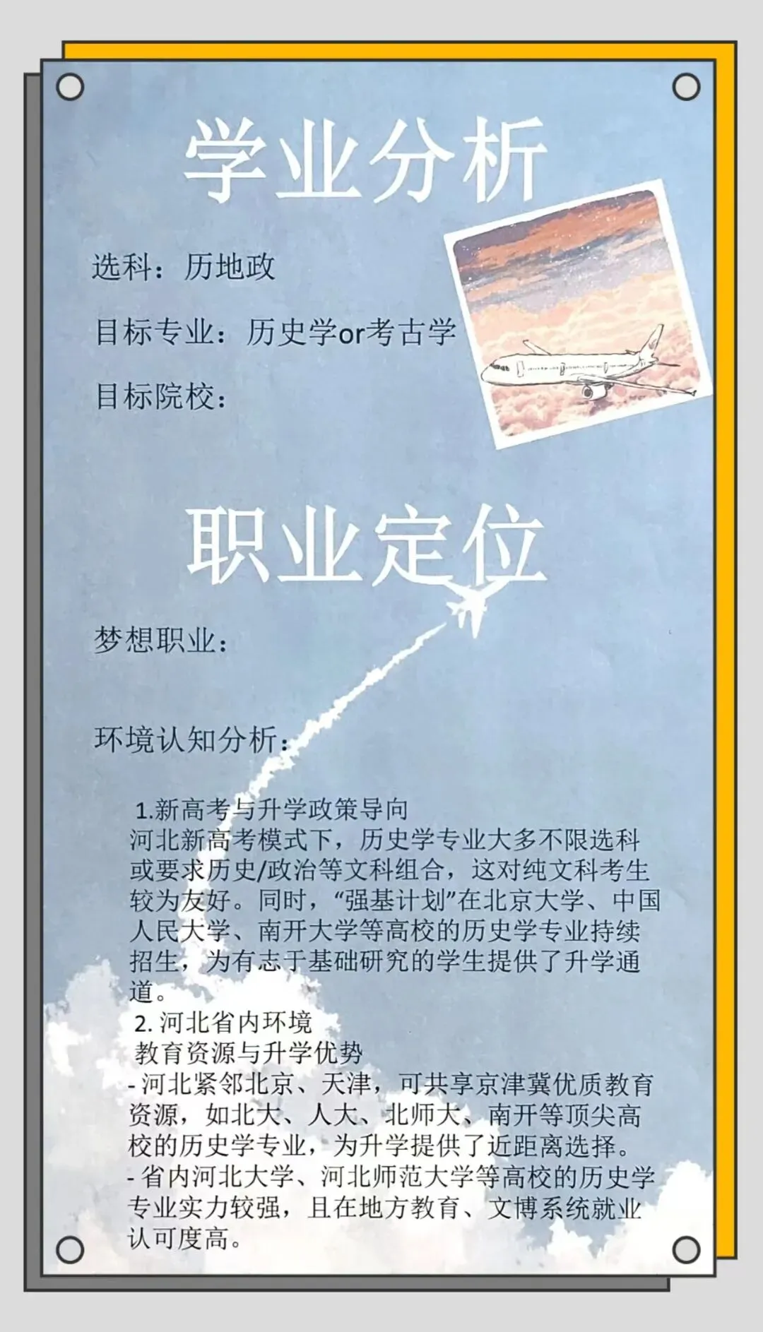 对理想生活的憧憬、对求学道路的锚定、对奔赴山海的决心,都藏在同学们笔下的生涯规划书里。石家庄一中的少年们以笔为媒,将青春的热爱、对自我的认知与对未来的思考凝于纸间,勾勒出一张张清晰的成长蓝图。今天,我们一同翻开这些满含赤诚的规划书,见证少年们心中闪闪发光的未来。