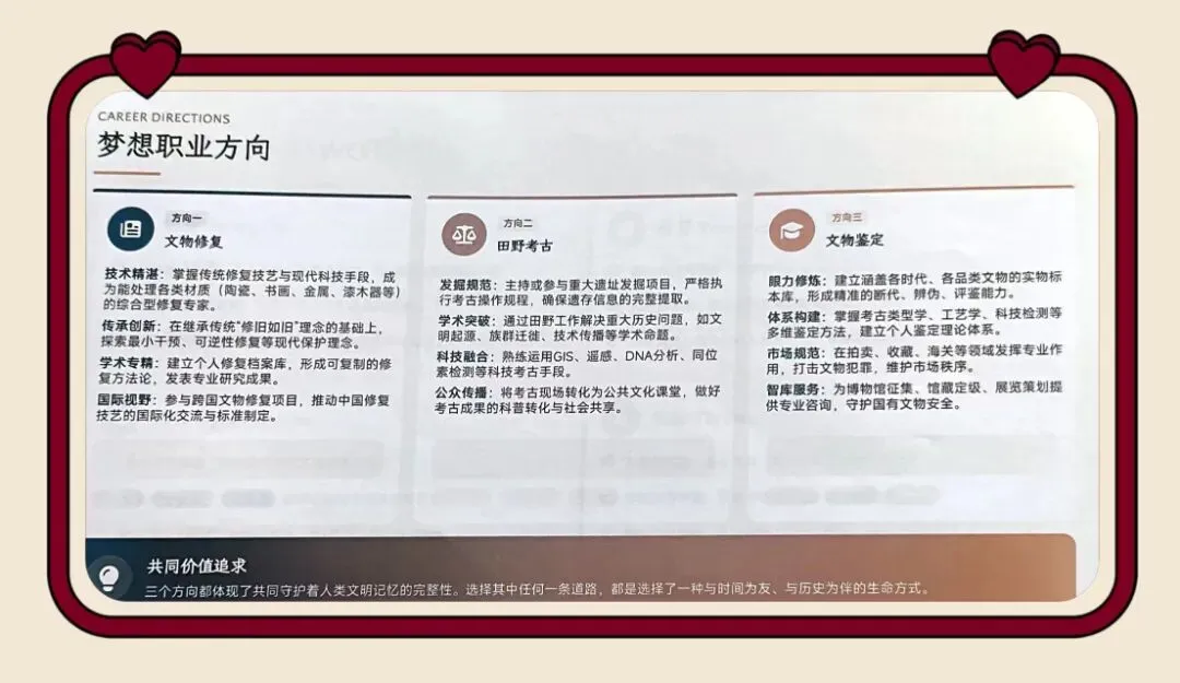 从深度的自我剖析、全面的环境认知,到笃定的职业梦想、详实的成长路径,每一份生涯规划书,都是少年们对未来的郑重期许。有人立志守护文明根脉,深耕考古与文物修复领域;有人坚守教育初心,渴望以师者之姿唤醒灵魂;有人心怀家国壮志,愿身披戎装守护山河;亦有人仰望星空,以青春赴航天之约。纸短情长,每一笔一画,都写满了少年人的坚定与热忱……