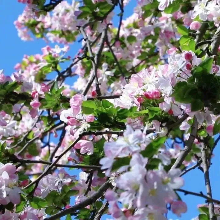 粉白相间的海棠花缀满枝头,嫣红的花苞、莹白的花瓣在蓝天映衬下摇曳生姿,风过处落英缤纷,随手一拍都是古风大片,是春日荣国府的绝对C位。