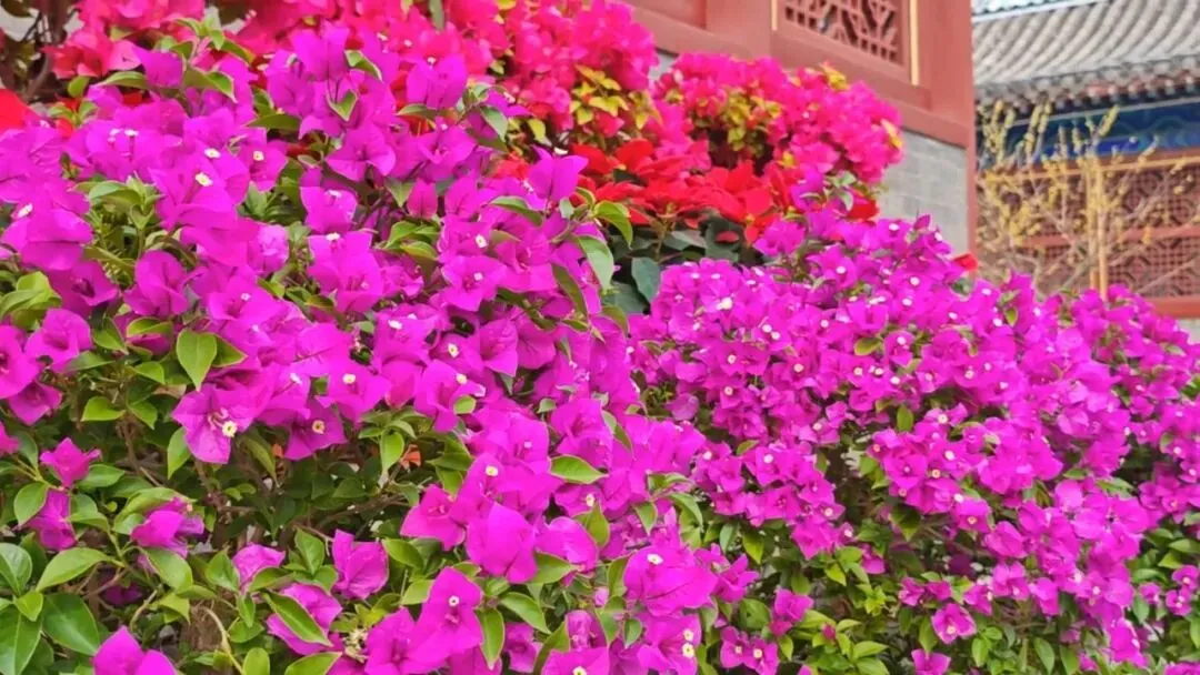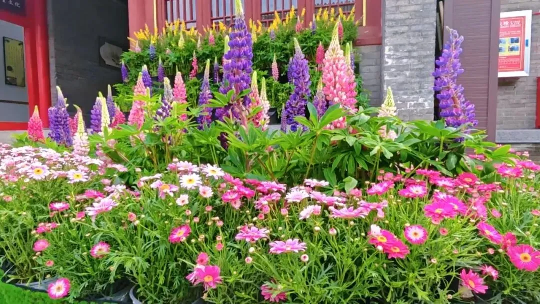 热烈的三角梅、色彩斑斓的鲁冰花、清新的雏菊错落排布,为古建庭院添上鲜活色彩,花藤秋千、造型花架更是打卡出片的绝佳点位!