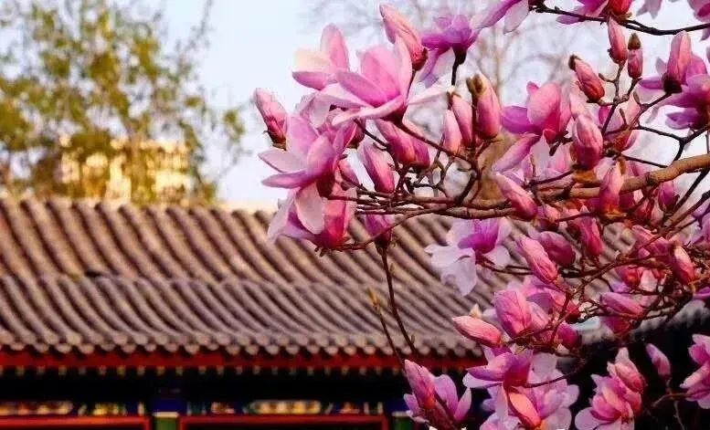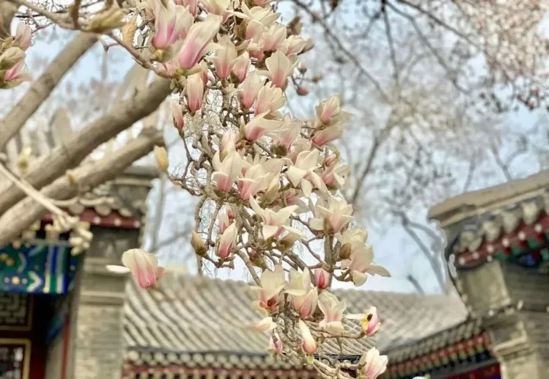 粉白玉兰缀满枝头,硕大的花朵在春风中舒展,与雕梁画栋相映,尽显古典温婉之美。