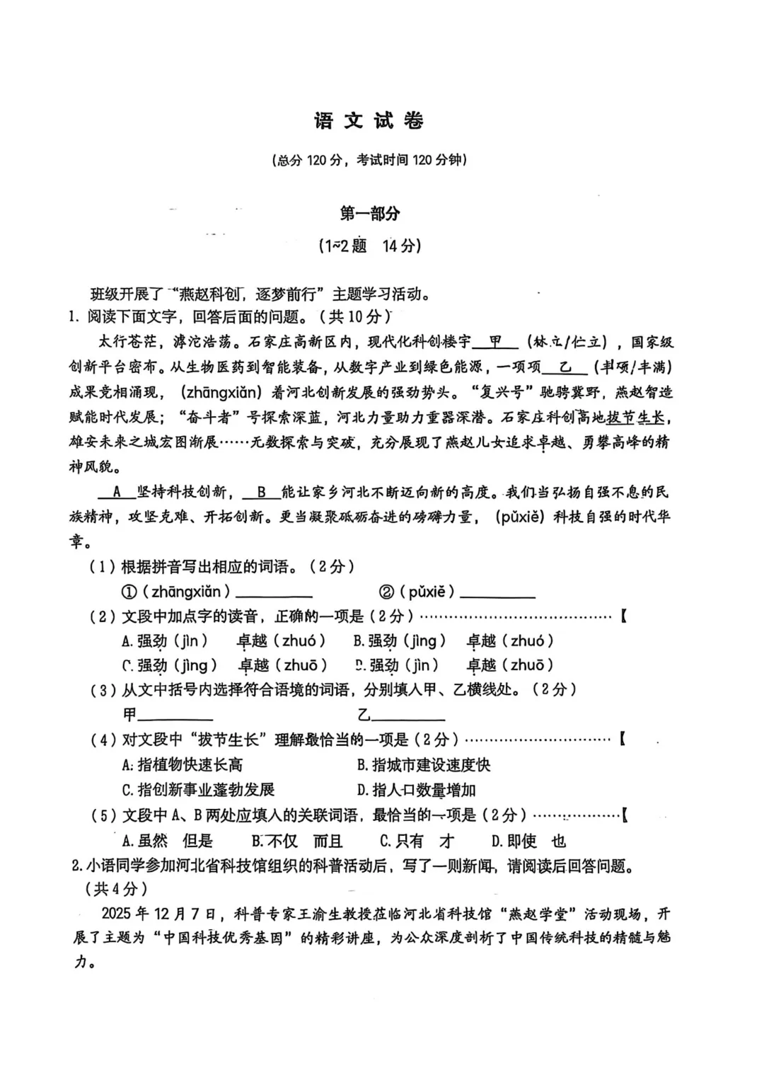 >2026年石家庄市裕华区一模语文试卷(可下载打印)