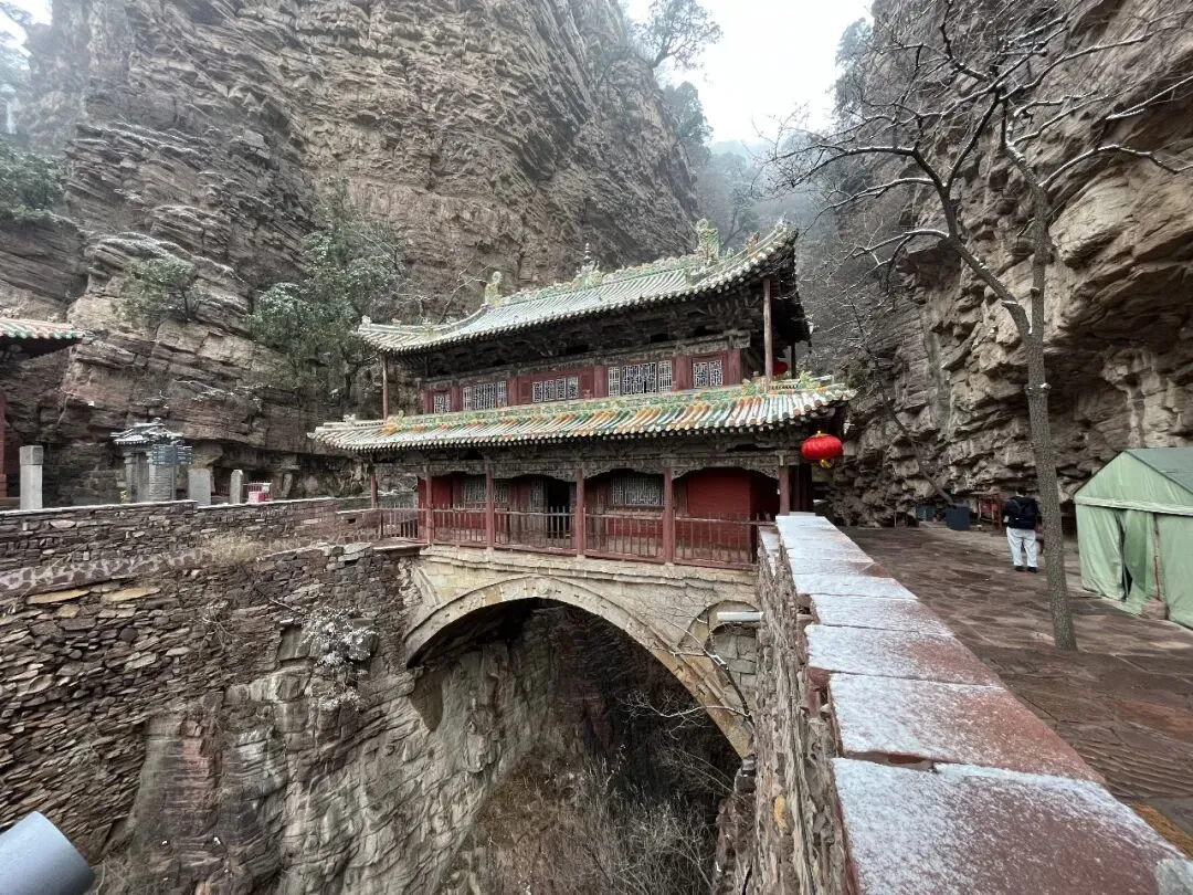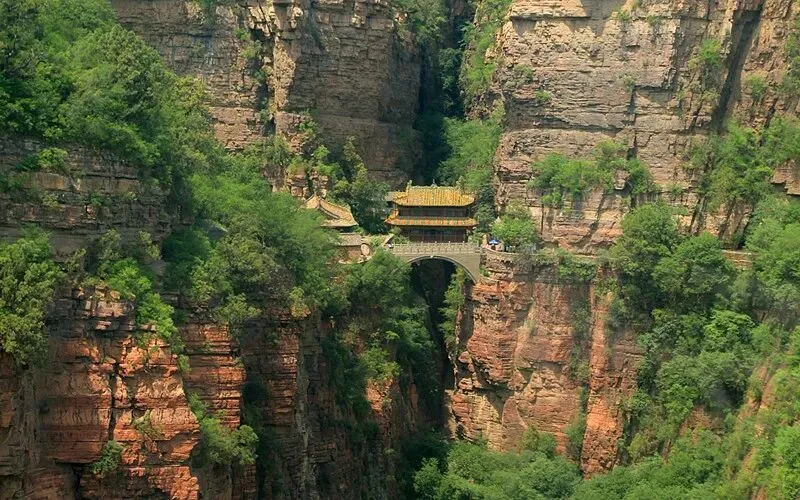 桥楼殿——中国三大悬空寺之一,世界独有的建筑奇观。两座石桥之上,一座朱红殿宇凌空横跨百米深涧,下临万丈深渊,上接一线蓝天。仰观云移楼动,俯瞰深谷如墨,赵朴初先生赞曰:"千丈虹桥望入微,天光云彩共楼飞。"