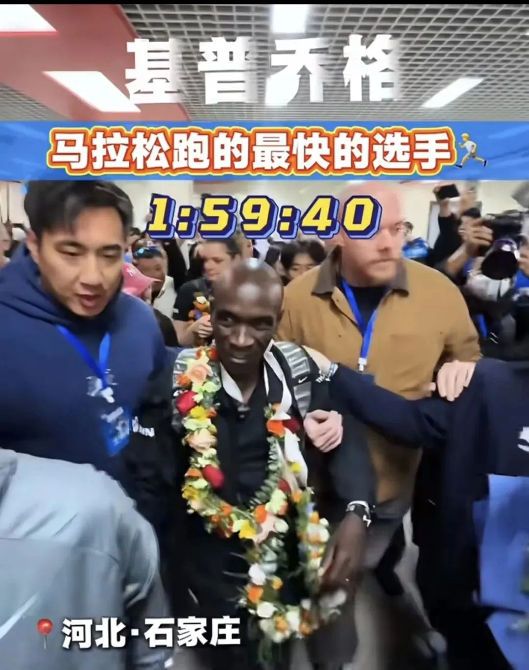 当埃鲁德·基普乔格——这个星球上最伟大的马拉松运动员、人类"破2"第一人、两届奥运金牌得主——走出石家庄机场通道的那一刻,数百名跑友的尖叫声几乎掀翻了屋顶。