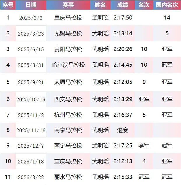 翻开武明瑶 2025-2026 的参赛履历,你会发现一个惊人的事实:除南京马拉松退赛外,所有完赛成绩均锁在 2:12-2:18 区间,没有一场 “拉胯” 表现。