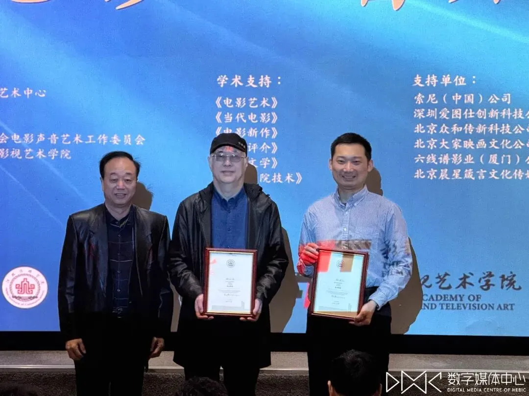 随后,中国电影家协会电影声音艺术工作委员会会长、北京电影学院声音学院博士生导师、国家一级录音师姚国强教授代表中国文联电影艺术中心和中国影协声工委发表了答谢辞。他感谢河北传媒学院为本次活动所做出的努力付出,并希望后续的合作能够更加顺利地开展下去。接下来,姚老师结合自己多年来的影视声音创作和教育经历,并结合自身专业领域作了有趣的专业分享,深入浅出地阐述了影视声音专业的相关前沿问题,为在场师生带来诸多启发。仪式最后,王彰平副校长代表河北传媒学院为姚国强教授和赫铁龙副教授颁发了河北传媒学院客座教授证书,现场气氛庄重而热烈。