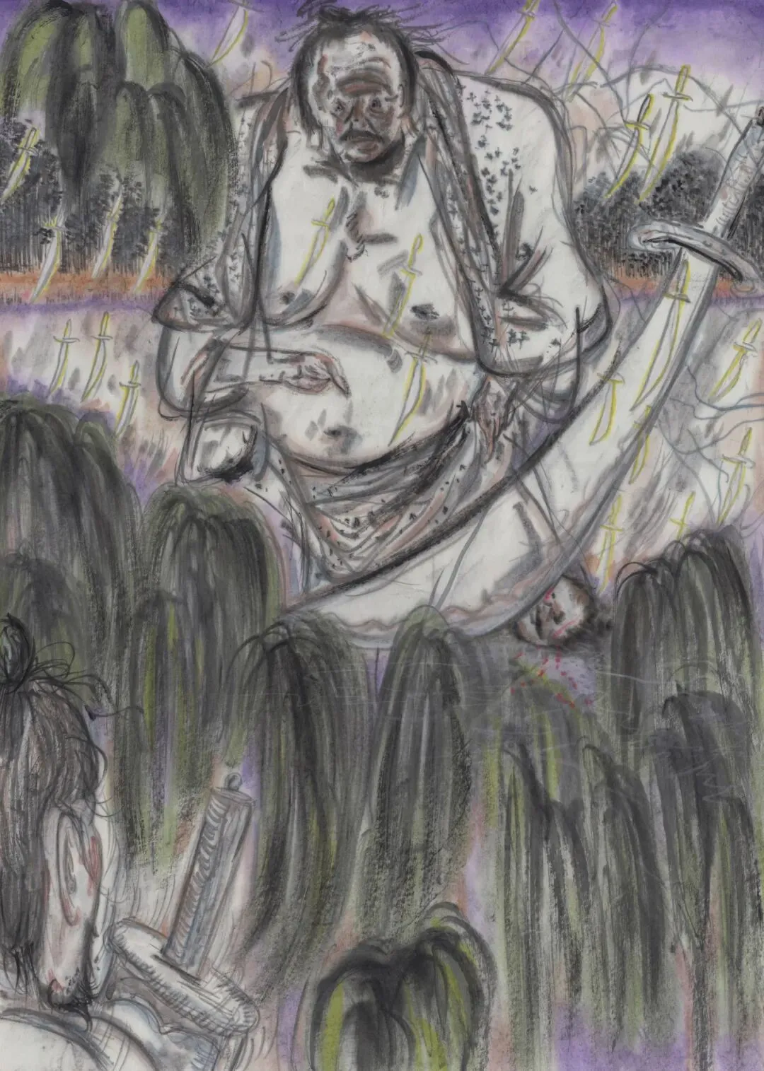 我画在生宣纸上,极难控制。控制笔锋,控制洇染的范围,控制湿度,把握下笔时机,抓住连贯气息,布局,经营位置,提前设想,给颜色和墨色的提前量……把宣纸当成一个要被“侵犯”的基底。承受一些它不习惯的东西。然后,在它几乎要被撕裂、被破坏的边缘,我再退回来,用传统的笔法去收拾、去牵引、去把那些暴力变成叙事等等。这个过程很像对话:我粗暴地提出一个议题,宣纸用它的洇染和韧性给出回应,我再根据这个回应调整方向。