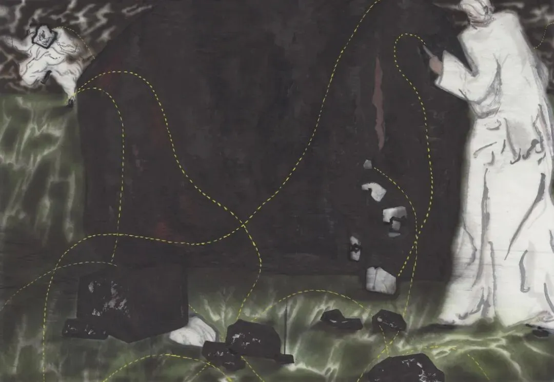石头这个东西,足够沉重,足够古老,足够沉默,传统国画里石头是有“风骨”的,而现在我并没有赋予它“雅”的隐喻。它可以有很多的含义,在我的家乡山西,见得最多的石头就是煤炭,其他石头也被空气中的煤灰染成不那么黑的黑色石头,它们就有了很多含义,“财富”“生计”“命脉”“红利”“危机”“生命代价”等等。当开始参与我的叙事,石头就变成一个有行动力的主体,不再是被欣赏的,而是成为一个“承受体”。