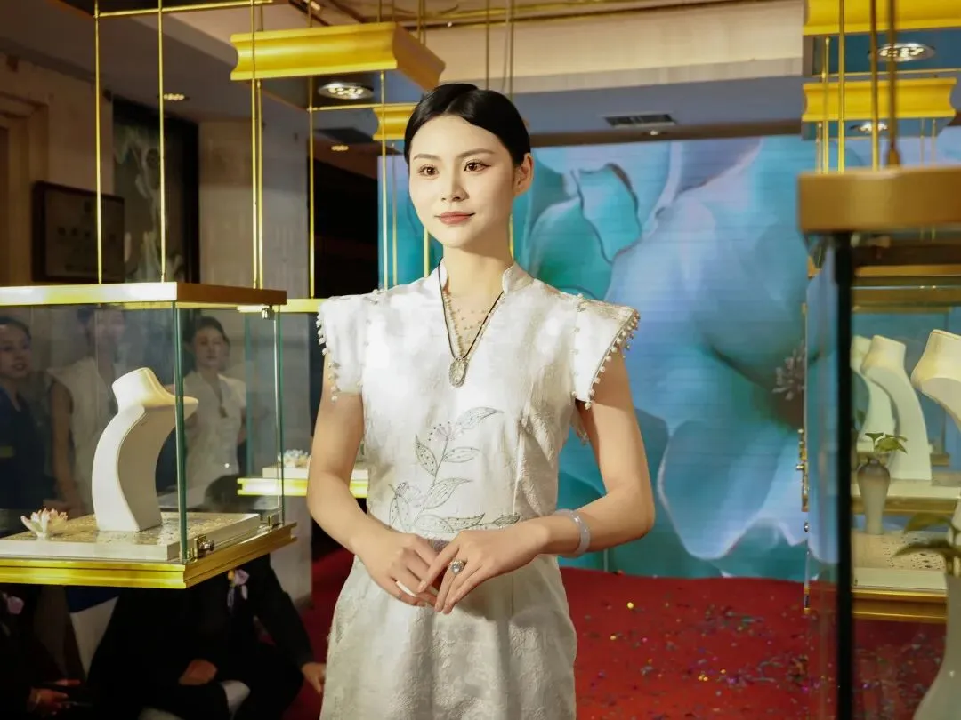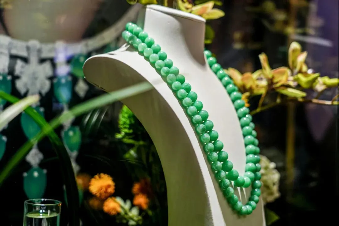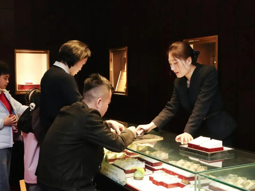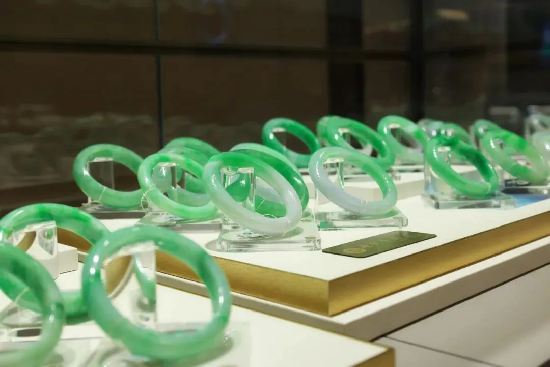 传家宝区手镯色泽浓郁如春水,种水俱佳;精品区佛公开脸慈悲、线条流畅,尽显匠心功力;典藏级珠链颗颗饱满、色泽均匀,气场全开。时尚新品区,翡翠镶嵌戒指、耳坠、项链等轻奢款,让大家眼前一亮。