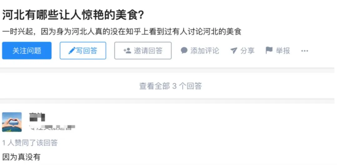 知乎上有个问题“河北有哪些让人惊艳的美食?”提问者说她身为河北人却没看到过有人讨论河北美食,所以想来问问,然而这个问题直接被一个回答终结,且非常扎心——“因为真没有”。