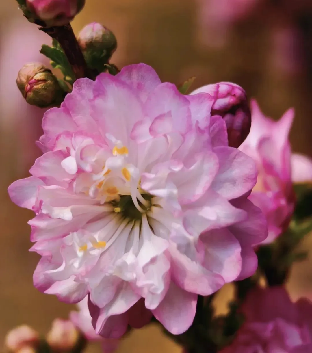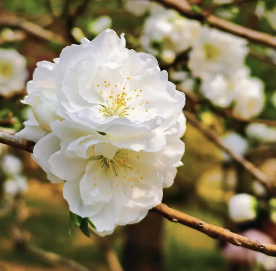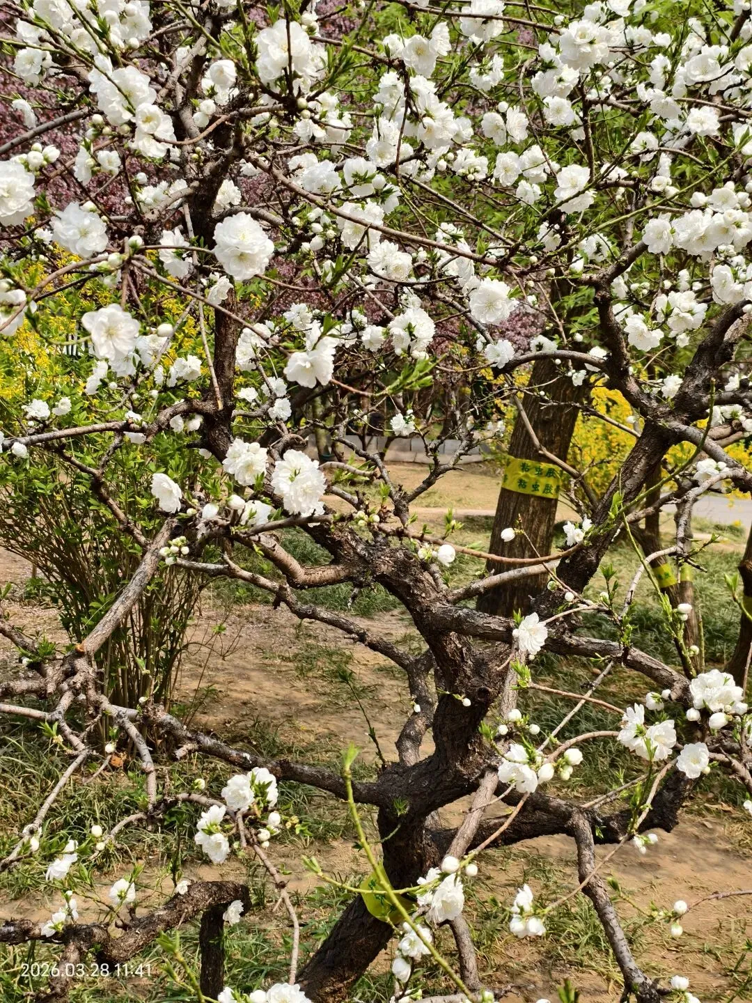 没有浓颜的色彩,素如白雪,纯净无暇,我感觉比红色更好看。这应该叫重瓣榆叶梅吧?花瓣层层叠叠,繁华满枝,一团团一簇簇!牡丹已经在悄悄孕育花苞了,根据往年经验,4月下旬会迎来盛花期。海棠,碧桃,榆叶梅,丁香花,玉兰花,红的、白色、黄的、粉的,真的可以用繁花似锦,五彩缤纷来形容石门公园的春天,石门公园不大,是我喜欢的样子!