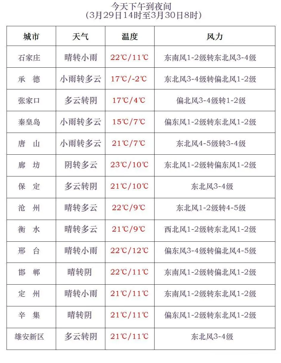 河北省气象台2026年03月29日11时发布天气预报: