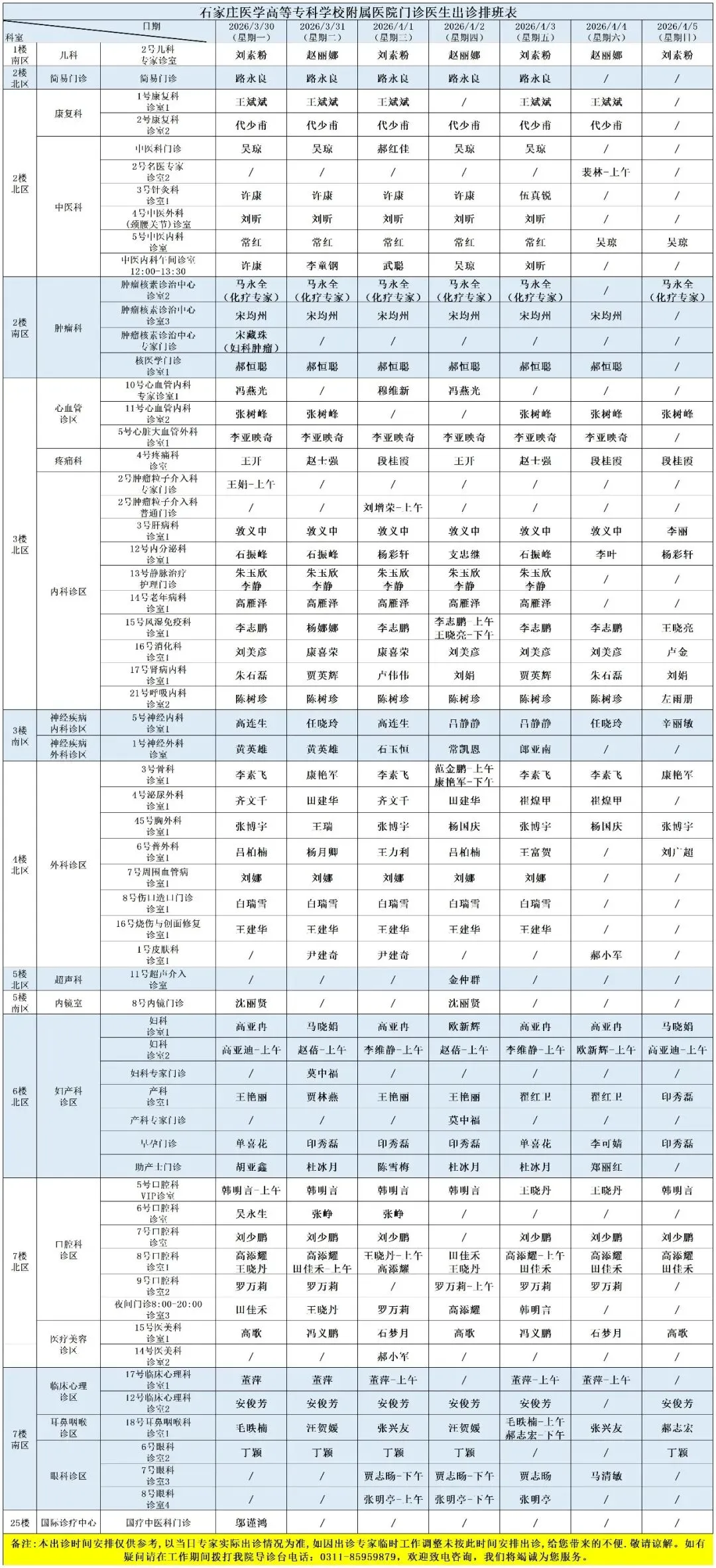 医院开设预防保健科、内科、外科、妇产科、儿科、眼科、耳鼻喉科、口腔科、皮肤科、医疗美容科、肿瘤科、急诊科、重症医学科、康复科、麻醉科、医学检验科、病理科、医学影像科、中医科等50余个一、二级临床、医技科室,能够完成疑难、危重患者的多学科综合治疗。