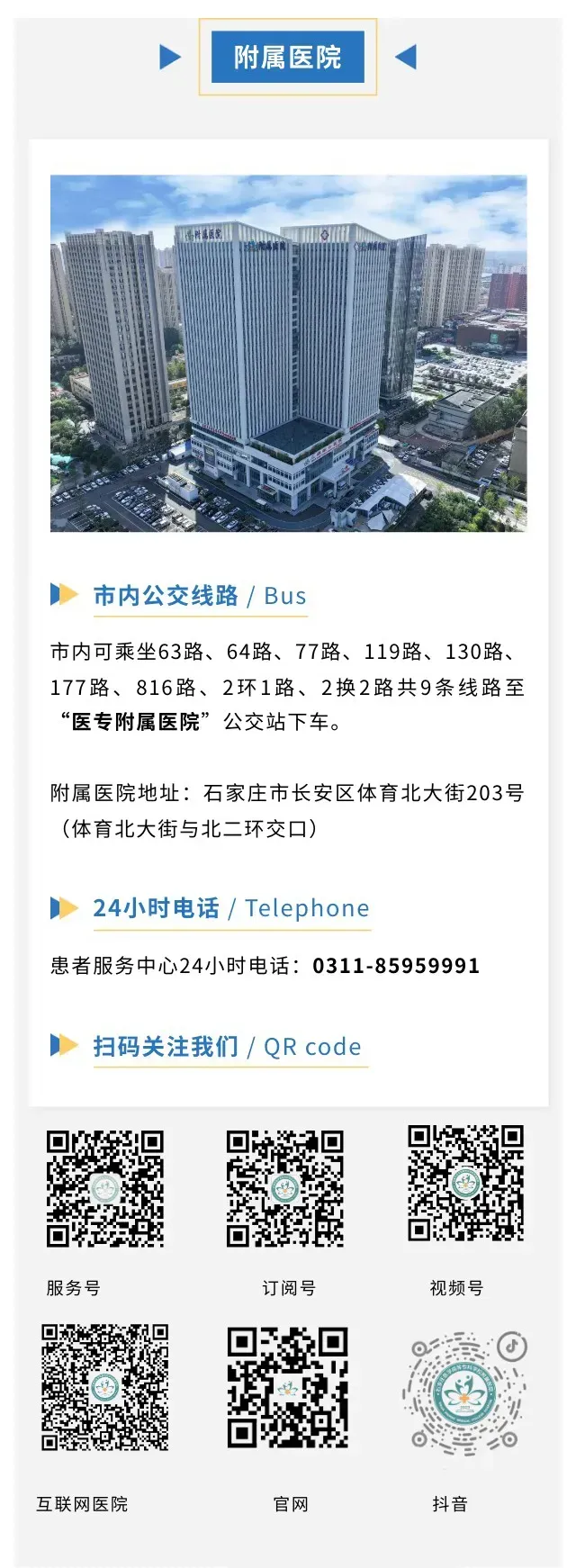 石家庄医学高等专科学校附属医院是一所非营利性三级综合医院,隶属于石家庄医学高等专科学校。医院位于石家庄市长安区体育北大街203号(体育大街与北二环交叉口东南角),占地60余亩。