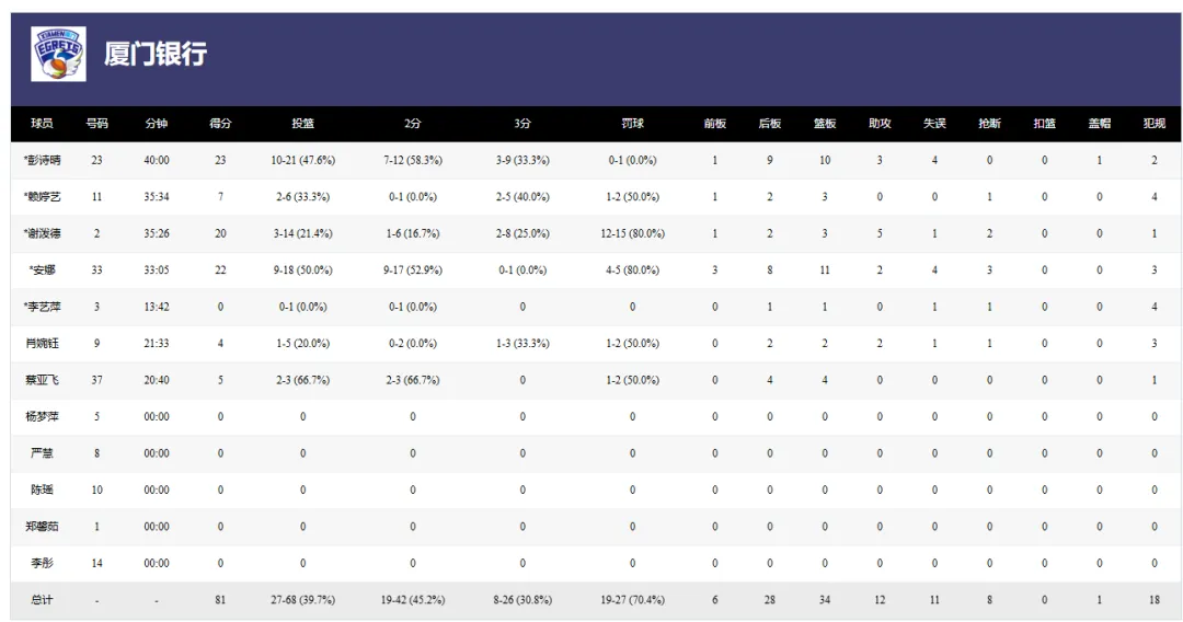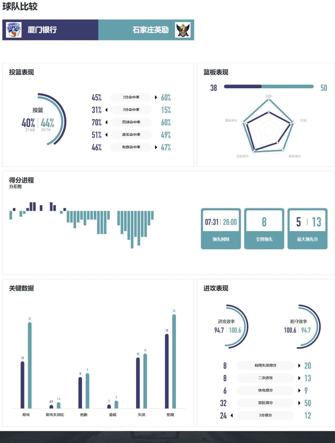 次节,石家庄英励远投依然打不开局面,两分球命中率也下降。厦门队把握机会,命中三记远投,在上半场结束时顽强地将比分扳成46平。