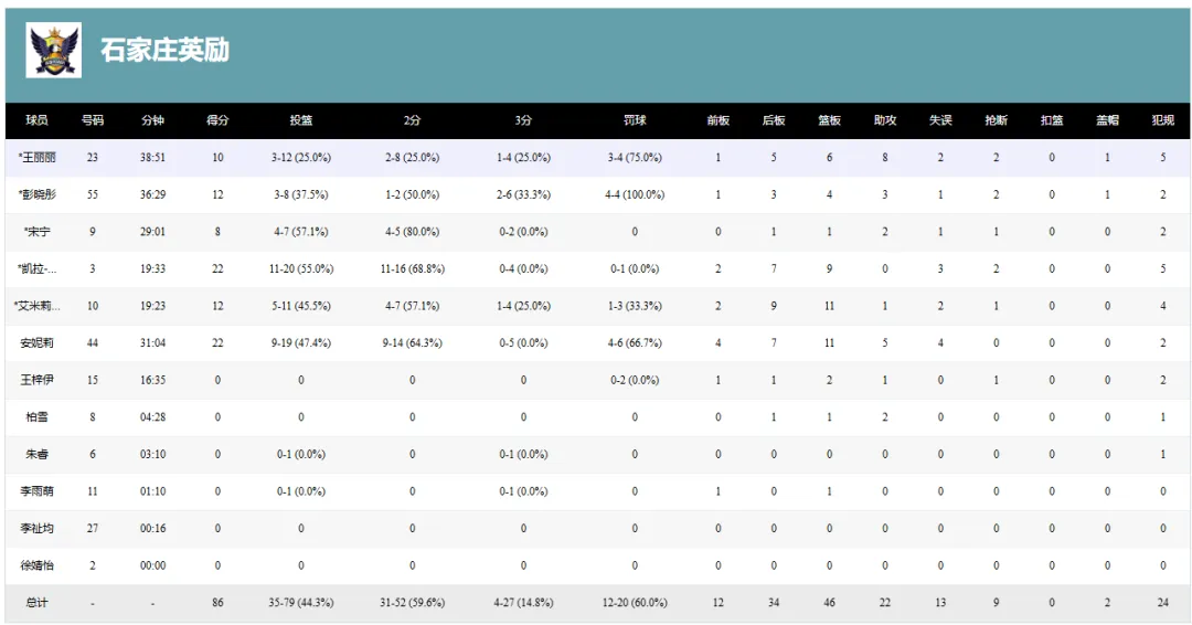 石家庄英励五人得分上双,戴维斯得到全队最高的22分,还有9个篮板。新外援安妮莉首次亮相表现出色,也砍下了22分。波特和彭晓彤均得到12分,王丽丽得到10分。