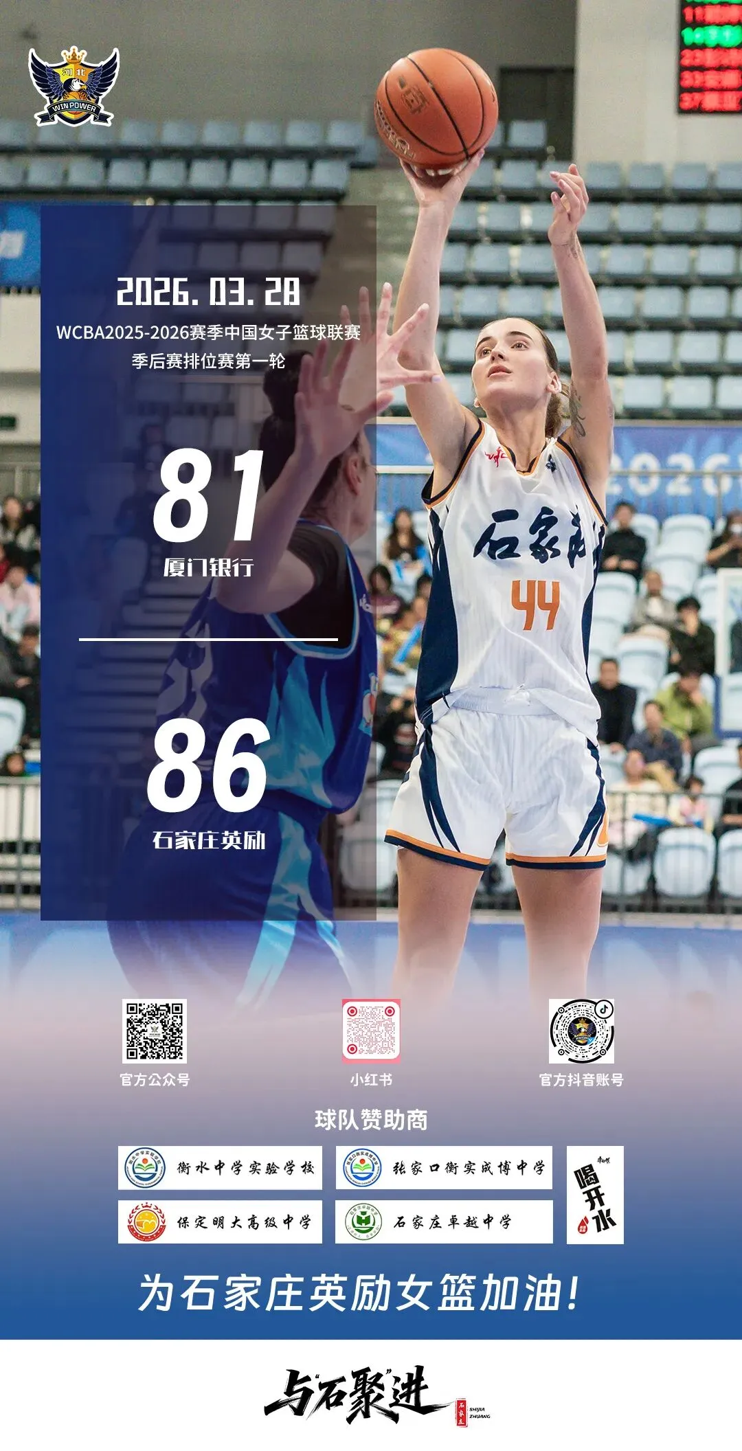 3 月 31 日 19:30,石家庄英励女篮将在河北体育馆主场迎战厦门银行女篮,这是WCBA季后赛排位赛(五局三胜)的第二场,也是石家庄首个主场。期待每一位球迷到场助阵,用呐喊为姑娘们注入力量,用掌声见证每一次拼搏。让我们并肩而立,为石家庄喝彩,为英励加油!