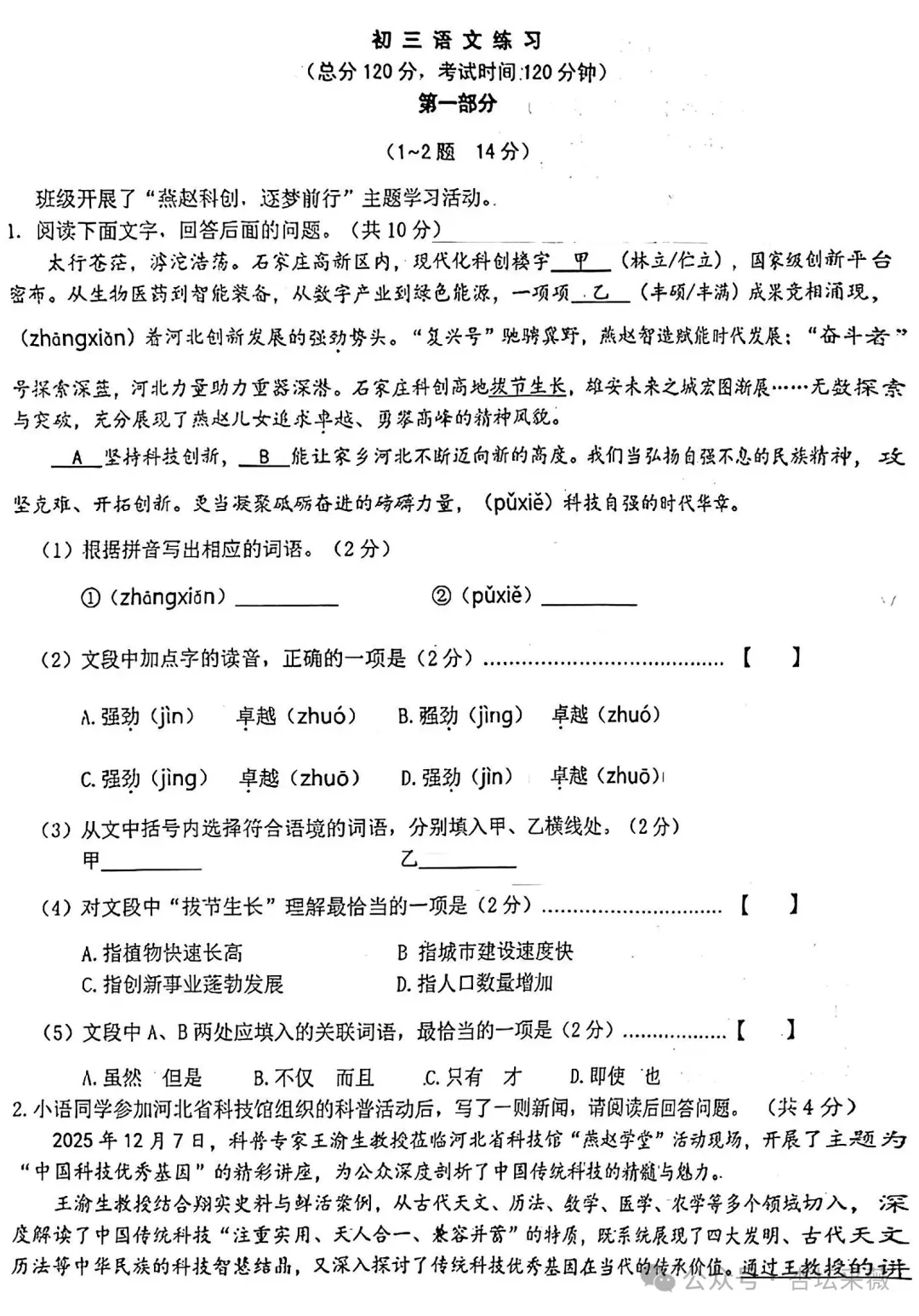 河北省石家庄市裕华区2026年九年级第一次学业水平检测全科试卷PDF电图片版,请到网盘下载。