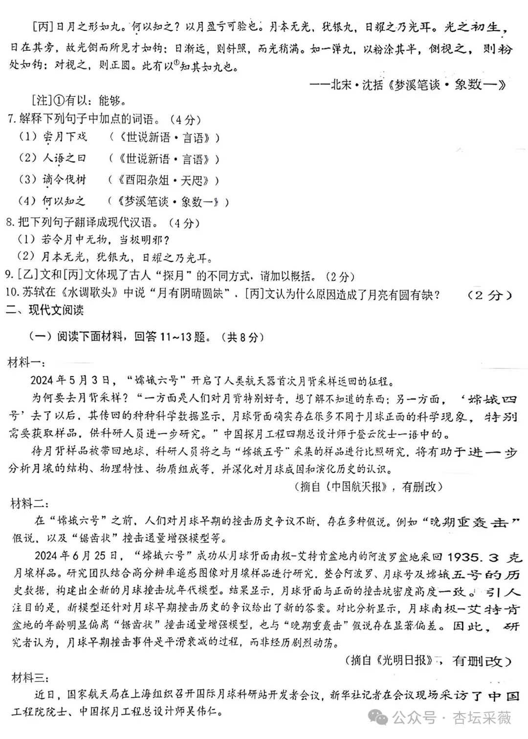 9.(2分)[乙]文重想象,以神话传说的方式探月;[丙]文重科学,以观察推理的方式探月。