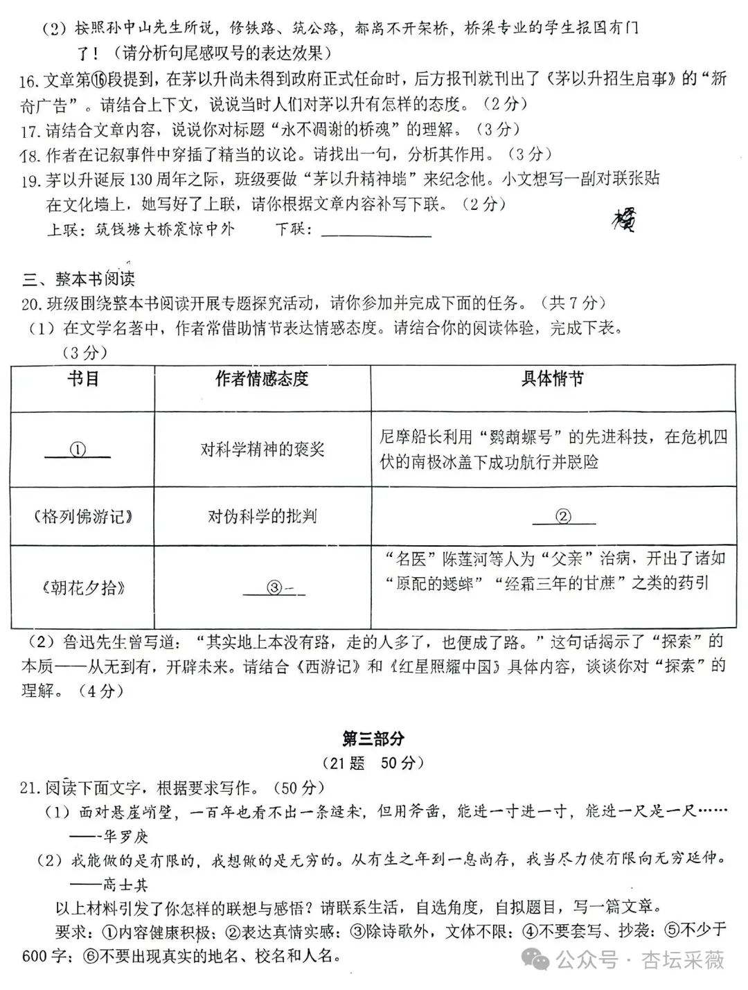 17.(3分)“桥魂”一方面指茅以升建造的钱塘江大桥,推动我国桥梁建造的发展,另一方面指他的精神之桥,即心中对祖国的热爱;“永不凋谢”是说他的精神跨越时空,永远流传,表达了对茅以升的赞美敬佩。