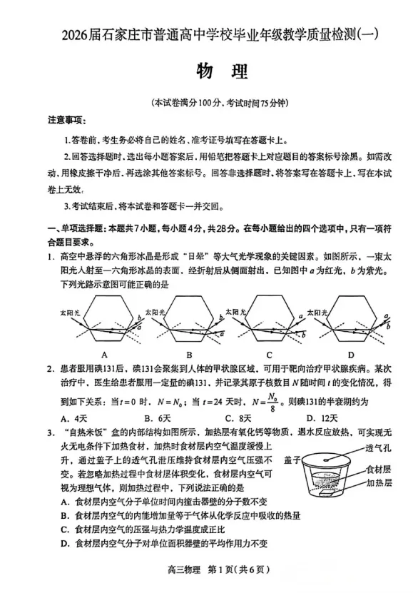 河北省石家庄市2026高三一模物理试题及答案