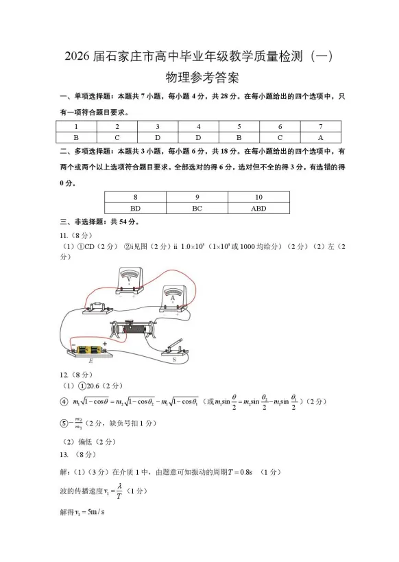 >河北省石家庄市2026高三一模物理试题及答案