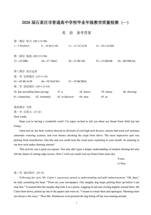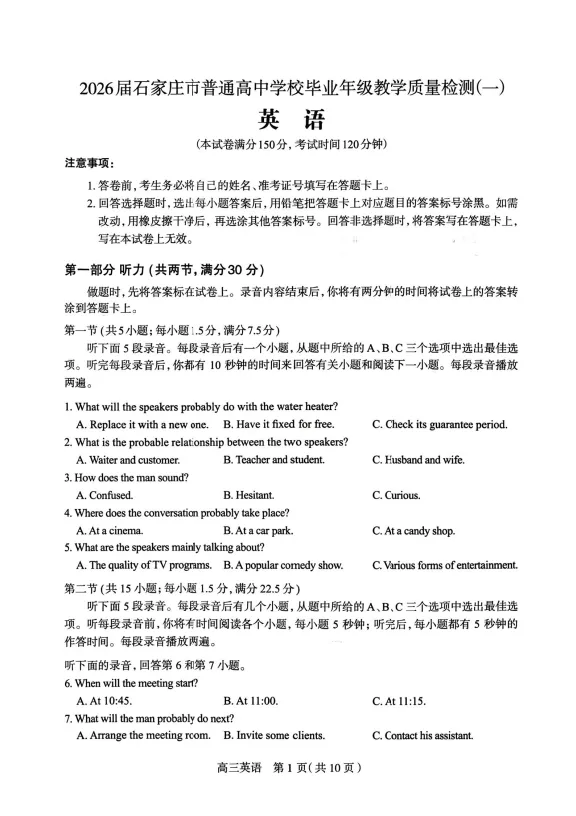 河北省石家庄市2026高三一模政治、历史试题及答案