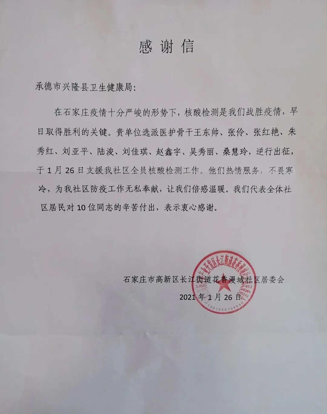 新年新气象,万事开门红。2月18日,农历新年后上班第一天,兴隆县卫健局收到一封来自省会石家庄的感谢信,信中对卫健系统部分援石采样医疗队员在石家庄市高新区长江街道花香漫城社区委员会开展核酸采样过程中,所展现出的热情服务、无私奉献的敬业精神和过硬的技术实力给予了高度赞扬!