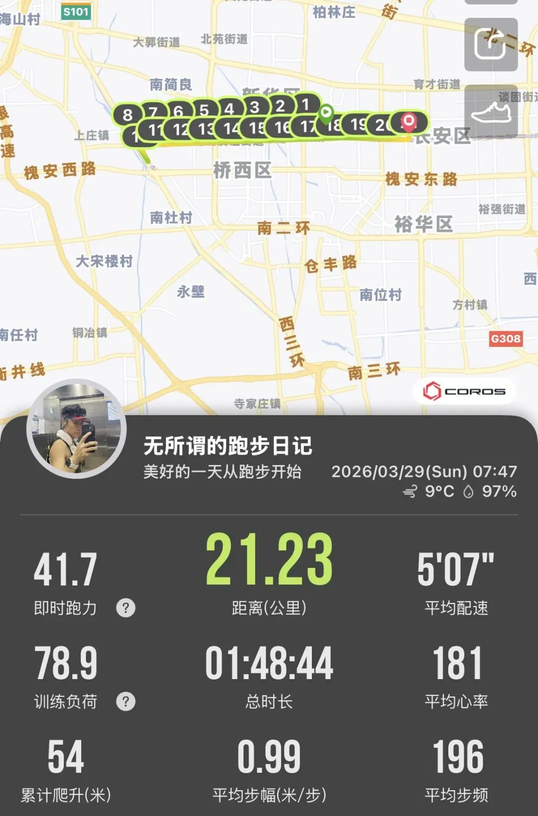 今日石家庄的气温看起来是9度,其实会更高点,因为太阳出来了,而且没有什么遮挡,所以体温其实会很难受。当然这体温还是比起南宁好多点。本以为湿度不大,但是前夜下了场大雨,今天的湿度还是有些大的,所以我的心率很顶,后半程基本在180以上,这很危险,不建议参考。虽然赛道没有什么爬升,但是有个隧道来回的时候因为坡度大,会影响节奏。其他都非常好!
