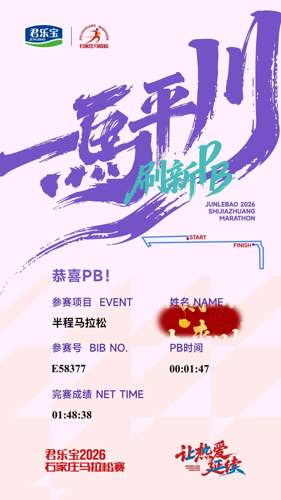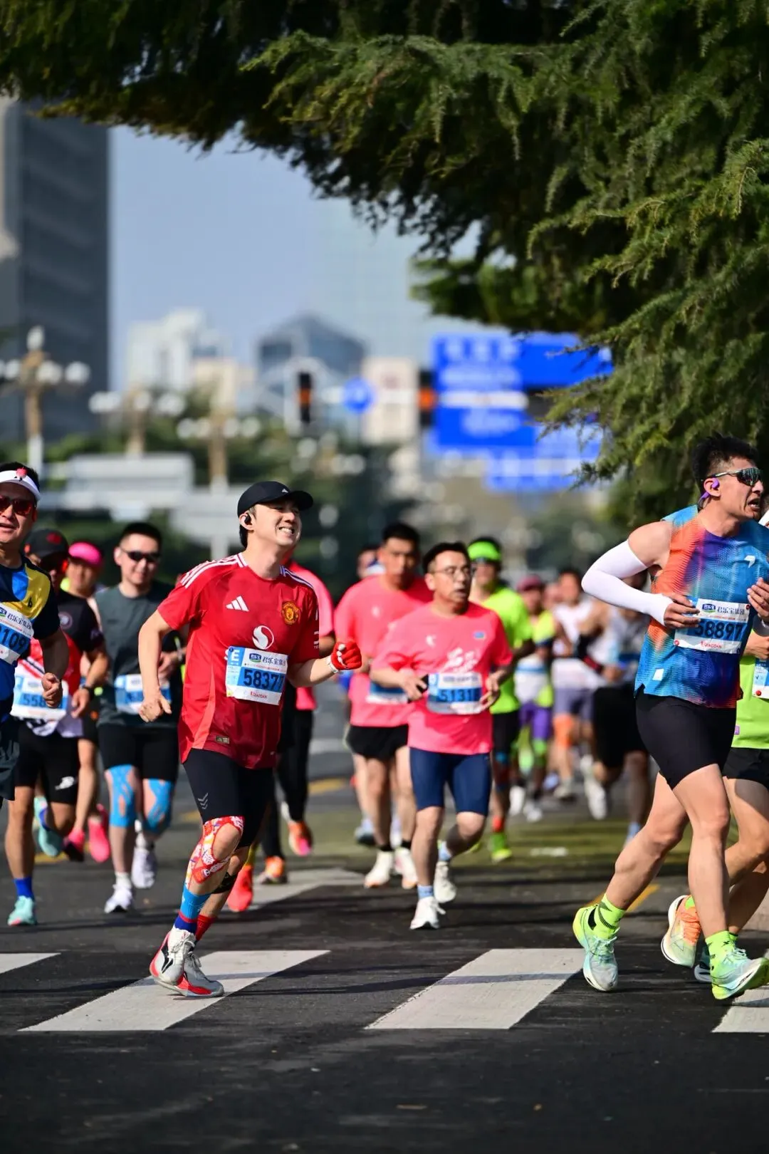 开跑的时候人比较多,我根据赛前的策略压着配速跑出去,不变道也不超车。虽然人多,但石家庄的赛道很宽,第二公里的时候我的配速就起来了,当然心率也起来了。算好前两公里的配速,比目标完赛时间多25秒,于是我在第三公里补了一支赛速饮,然后开始加速,心率就马上飙到175。第五公里的时候我已经把落后时间追到差2秒,没进补给站,补一支液体盐丸后继续冲。第五公里到第十公里是我感觉最舒服的一段。当时感觉体感好,腿有力,可以很好地控制跑姿,这一段追了很多时间。等到第12公里的时候我已经有富裕的69秒了,可是当时突然感觉力竭了,而且心率很顶很难受。于是我在12.5公里处进补给站,用水开始浇灌我的身体和腿,等心率下来一点后再继续跑,跑出补给站的时候我看见345的全马兔子群,于是就跟着跑,等状态好些了就超过他们继续追时间。 这一段我的富裕时间从69秒掉到了50秒。(第五到第十公里的从容)跑过第15公里后我又不行了,于是我又进了补给站。到16公里时我富裕的时间只剩下28秒。我感觉自己快不行了,想把身上最后一支赛速饮给喝了,可本来计划是在第18公里冲刺时候喝的,这回真的赛速饮带少了。出了补给站我又看到了345全马兔子群,于是我又一直跟着,没有喝那最后一支的赛速饮。当时感觉自己快不行了,总觉得开始掉速了,等跑到第17公里的时候发现竟然没掉速,还能保持配速在5:07,于是就开始超过兔子群,想着还有不到一公里就可以马上喝赛速饮了,心里作用还把速度带起来了,所以第18公里跑了一个4:55的配速。看完表后马上掏出那最后一支赛速饮,虽然喝完好像身体也没觉得好,但是心里作用大。第19公里保持配速5:07,当时感觉已经争取到60秒富裕时间,只要不出意外,掉速到5:30也可以PB。我一边想一边顶着,第20公里跑了4:59。还有一个人来拍了我肩膀,我也不认识,我当时听着音乐,也不知道他说啥,怀疑他可能是看我穿曼联球服,跟我打招呼,我回了一句:明年欧冠见,就继续跑了。跑过第20公里有个补给站,因为时间富裕,我就再次用水浇灌我的身体和脚,大概只用了几秒钟,然后就继续冲。第21公里的速度已经提不起来了,也没有了之前那种看见终点就可以冲的力量,等真正过了终点,我感觉这回有了!一年了…我终于PB了。第21公里我的配速5:15,完赛净成绩1:48:38,PB107秒。赛前目标是跑进150,也就是跑到1小时49分左右,没想到竟还能跑到148,这回真的释然了。下个PB,等明年再说了。但更更更重要的是有机会见到了天南地北、素未蒙面过,但一直有在互相支持的跑友们。他们给了我很多快乐和加持!期待下一次、在下一个城市,我们再相遇...