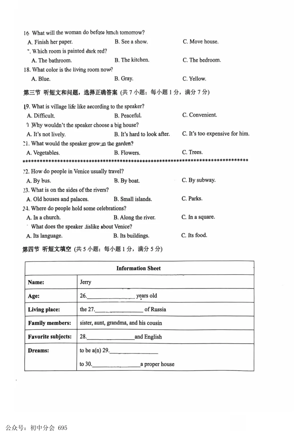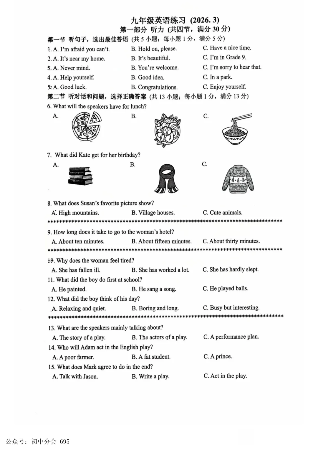 2026.3九年级中考摸底检测试卷及答案(全科含听力)