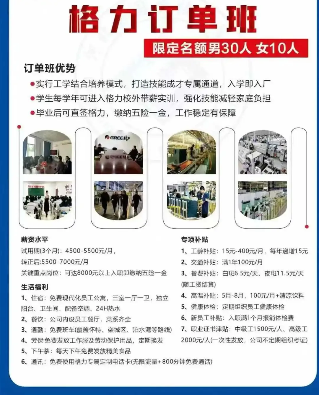 免费员工公寓,通勤班车,员工食堂,劳保用品,下午喝茶,免费使用格力电话卡(流量通话都够用)