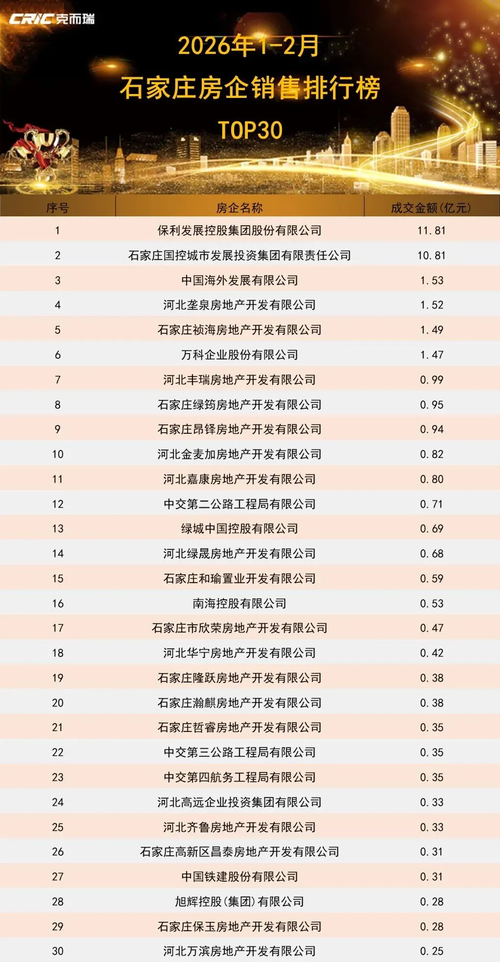 其中,保利以11.81亿元的销售金额排名榜单第一位;石家庄城发投以10.81亿元的销售金额居于第二位;中海以1.53亿元位列榜单第三位;河北垄泉以1.52位列榜单第四位;石家庄祯海以0.68亿元的销售金额排名榜单第五位;TOP10榜单门槛最终由河北金麦加锁定为0.63亿元。