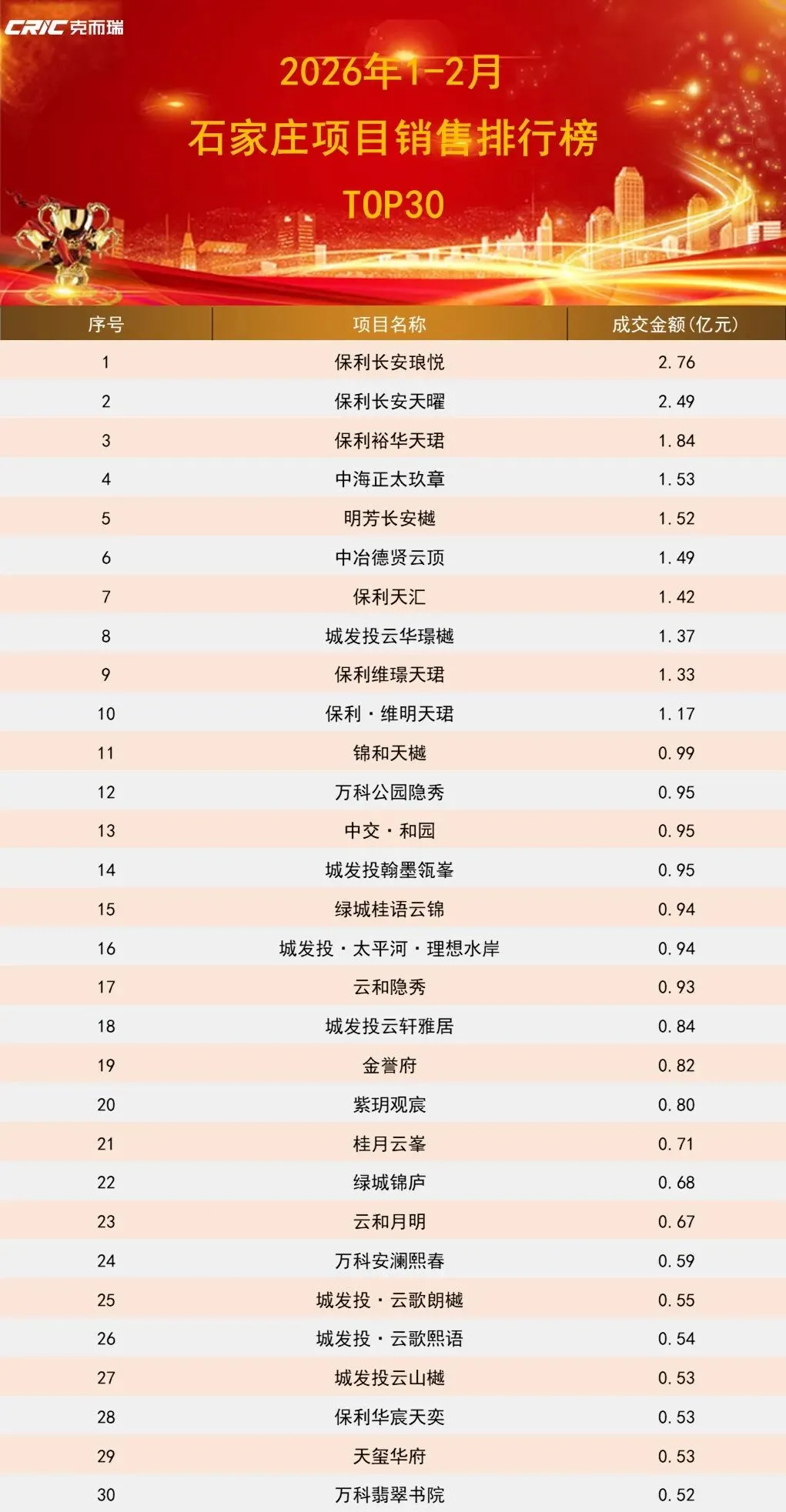 成交金额方面,长安区改善项目保利长安琅悦,以2.76亿元位列榜单第一位;长安区热点项目保利长安天曜,以2.49亿元的成交额位列榜单第二位;裕华区改善项目保利裕华天珺,以1.84亿元位列榜单第三位;桥西区热点项目中海正太玖章,以1.53亿元的成交额位列榜单第四位;长安区新盘明芳长安樾,以1.52亿元位列榜单第五位。