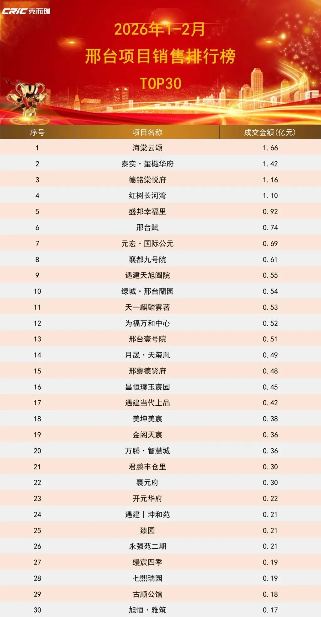 邢台排行前30位在售项目的成交总金额为16.07亿元,成交总面积为18.98万㎡,成交总套数为1507套,成交均价8469元/㎡。