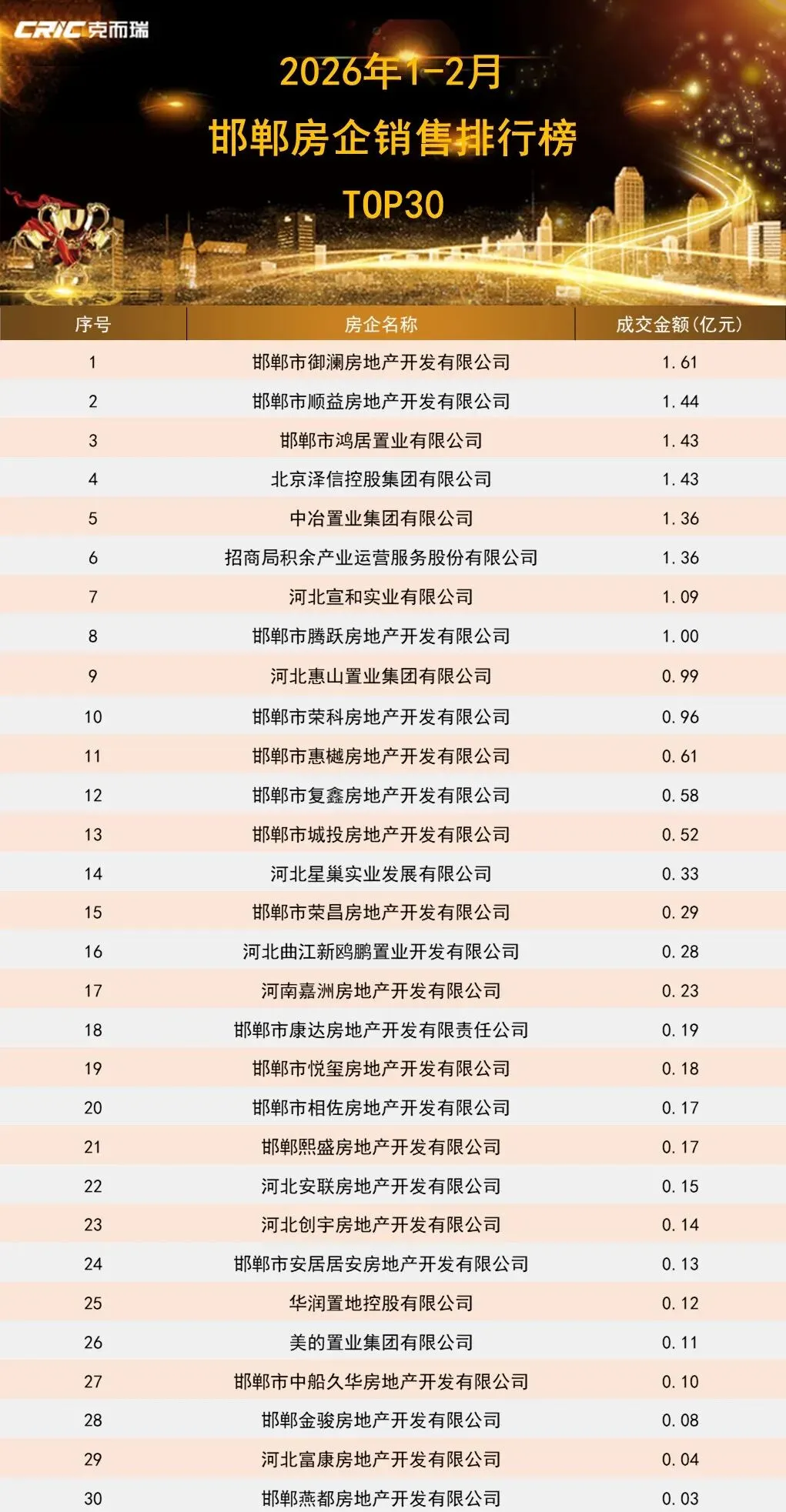 其中,邯郸市御澜房地产开发有限公司以1.61亿元的销售金额排在首位,获得区域内榜单第一;邯郸市顺益房地产开发有限公司以1.44亿元的销售金额排名第二;邯郸市鸿居置业有限公司以1.43亿元的销售金额排名第三。TOP10榜单门槛锁定在1.00亿元。