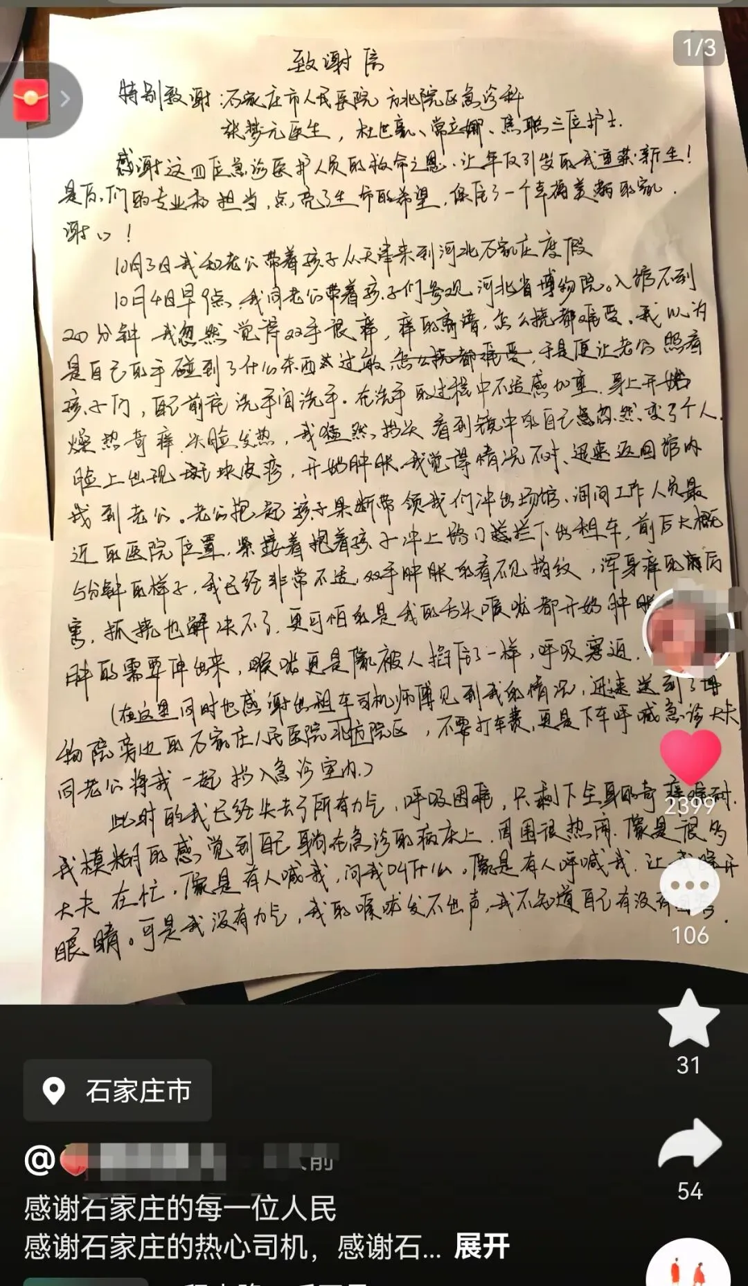 不仅如此,为了让这份温暖传递更远,白女士又将这封感谢信发布到了网络平台。这条充满正能量的视频迅速引发了广泛关注,点赞超过2300次,无数网友被石家庄医务人员的职业担当和这座城市的温暖所感动,纷纷留言点赞。