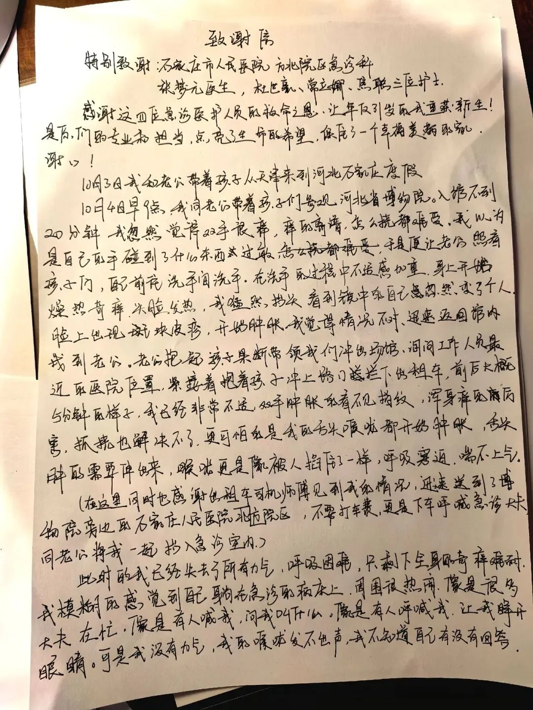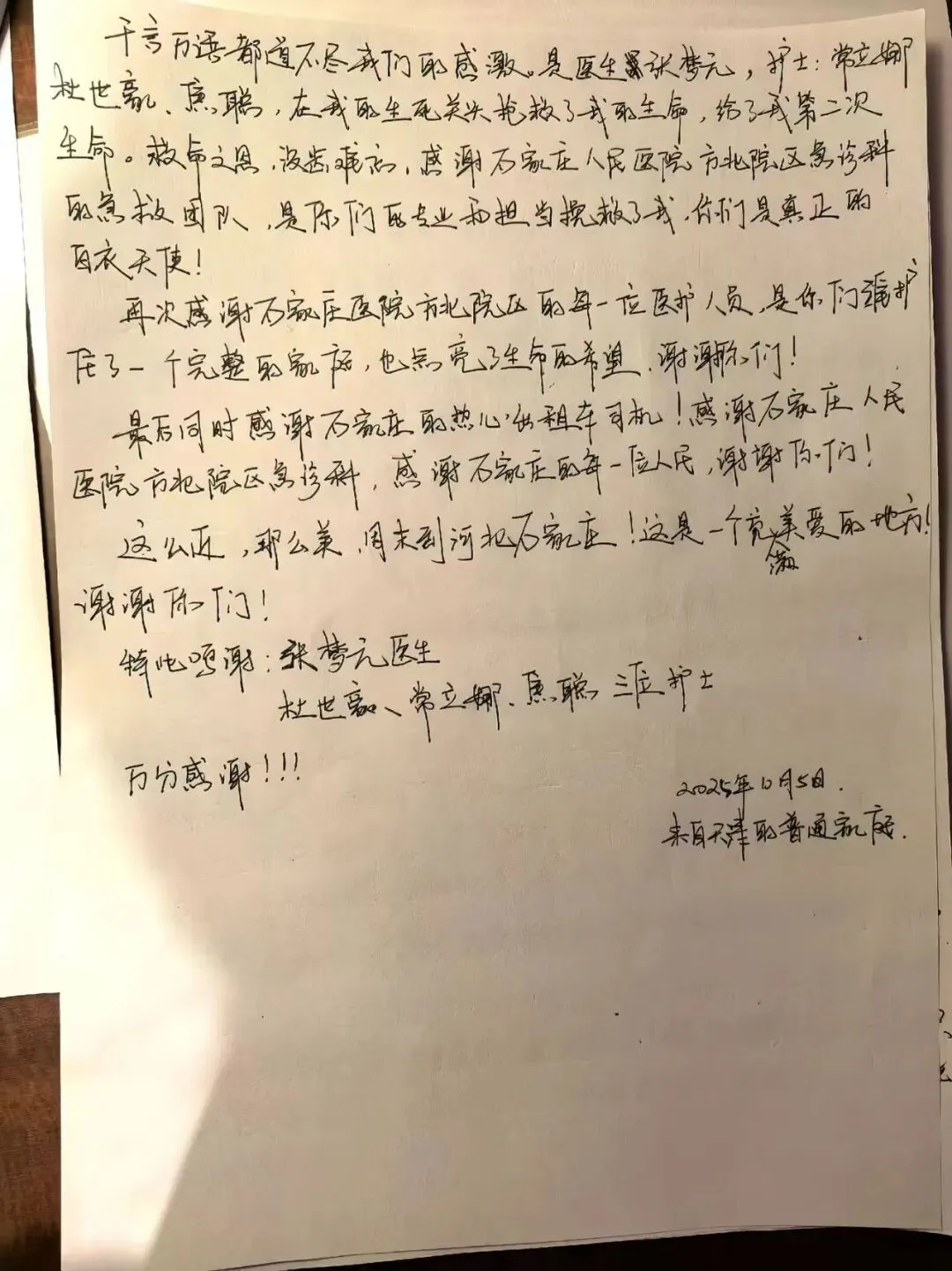 “千言万语都道不尽我们的感激。是医生张梦云,护士常立娜、杜世豪、焦聪,在我生死关头给予全力抢救,给了我第二次生命,拯救了一个家庭……感谢石家庄人民医院方北院区急诊科的急救团队,是你们的专业和担当挽救了我,你们是真正的白衣天使!”字里行间,充满了白女士对参与抢救医护人员的深切谢意。