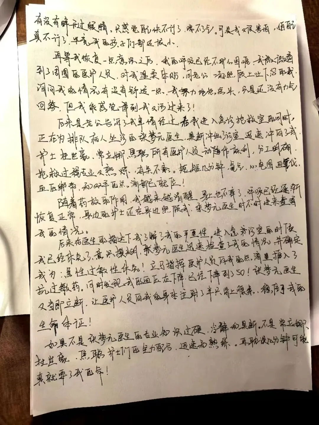 病情稳定后,白女士从丈夫口中得知了抢救过程的全部细节,也了解到自己病情的凶险——急性过敏性休克,当时若再耽搁几分钟,后果不堪设想。这份沉甸甸的救命之恩,让白女士无法释怀。她将内心的澎湃感激诉诸笔端,亲手写下了一封情真意切的感谢信,郑重地递到了急诊医学科医护人员手中。