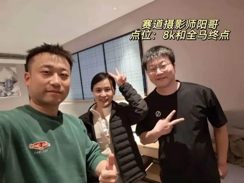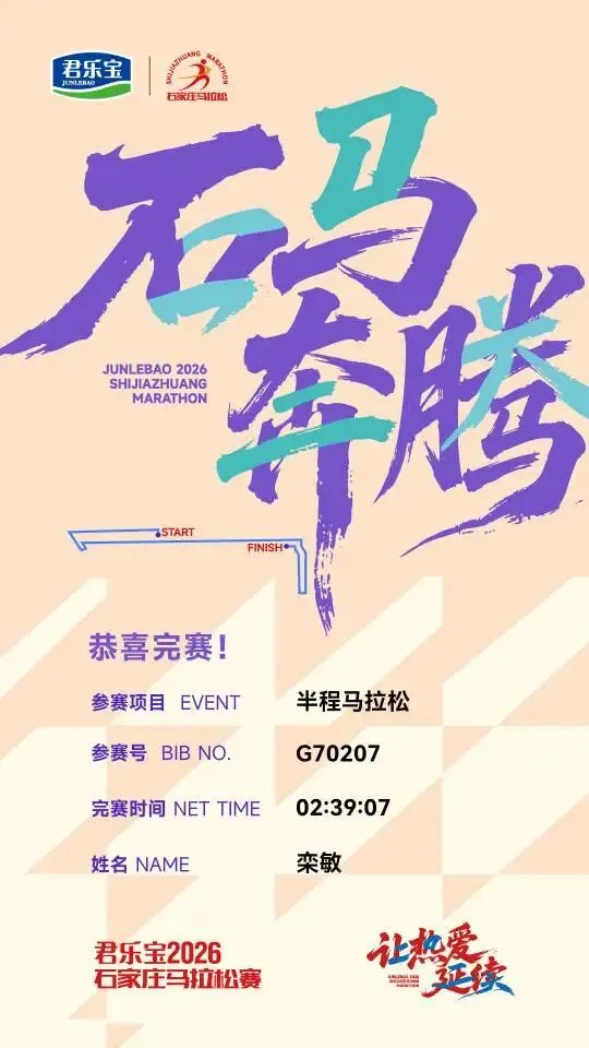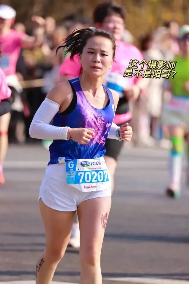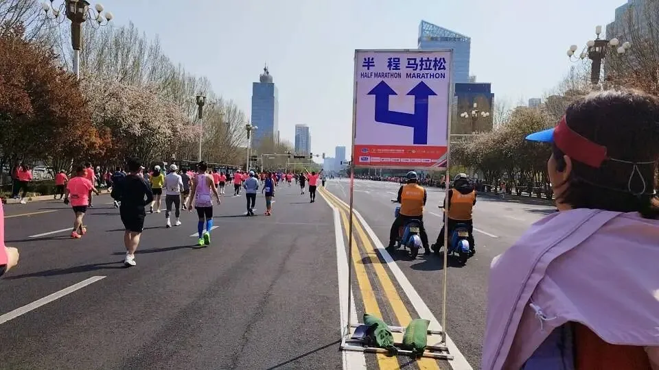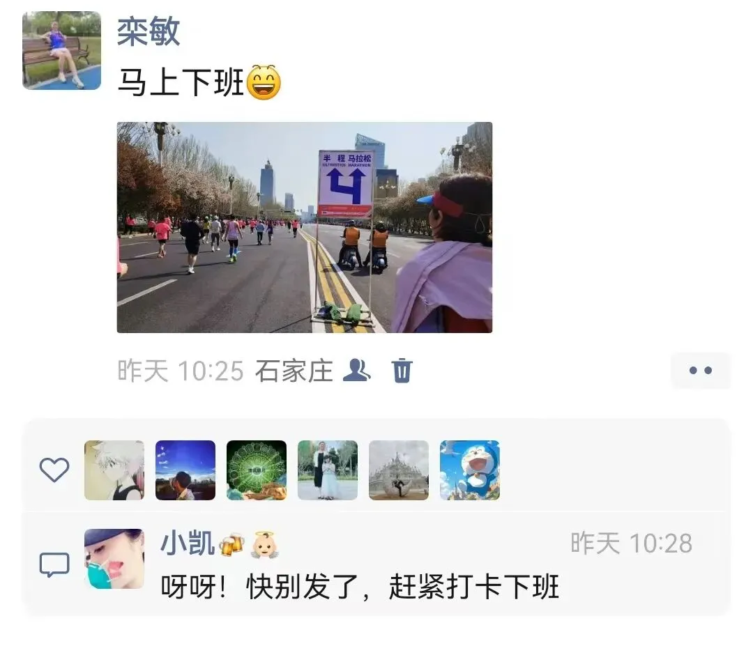 毕竟停跑一冬天,上周日又刚跑完安阳半马,28号一大早4点就背着团旗往石家庄赶,为了能跟上团长沈乌贼的活动,下午又跟小伙伴们去景区特种兵式的打卡。开跑就是6分多,我目不斜视心无旁骛的一直往前跑,就是为了早点到阳哥的拍照点位,可不能像去年郑州马拉松2025郑州马拉松一样,让他等我那么久了。快到8K的时候,我就一直左右看,期待能在人群中看到那个熟悉的身影。是的,阳哥早就看到我了,阳哥不语,只是默默的按快门,才有了赛道上这么真实的影像记录。放上他的生活照,大家在赛道上看到的时候大喊一声:我是18的朋友,阳哥就会咔咔咔咔·····照片多到数不完!没有跑量堆积的马拉松是痛苦的,告别了阳哥,折返后,太阳渐渐热烈起来了,如同赛道两边热情的观众,热烈又热情。我的表情也从风轻云淡逐渐变得面目狰狞,腿不是累,是沉,沉到抬不起来,每一步都像踩在棉花上又裹着铅。脑子里的两个小人儿又在打架了:别跑了,走路也能到终点 VS 我还能跑两步儿······这时想起来墨镜唯一的好处就是看不到你的痛苦面具,多希望这时候能有一个魔法眼镜啊,这样你们就看不到我有多狼狈了······纠结着,挣扎着,跑着······猛一抬头,看到这个分流牌,我又支棱起来了。哈哈,马上下班了!最后几步了,跑快点儿就能早下班。边对自己说着,边默默提了速跑起来,顺带开心的发了个朋友圈。你们的凯姐催我了,我得加油干了!三下五除二,冲线!下班的感觉真好!