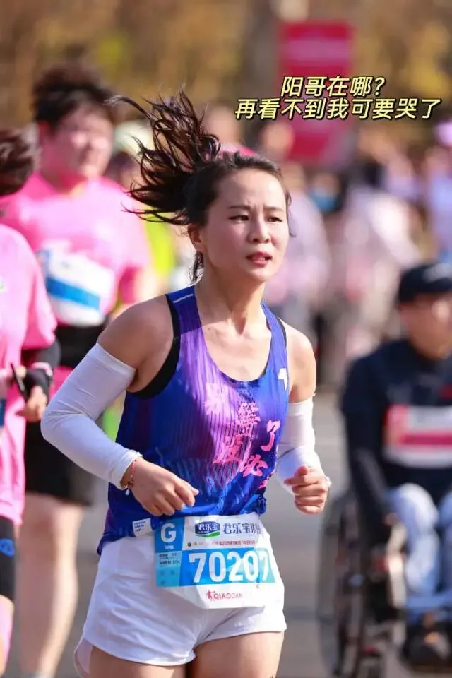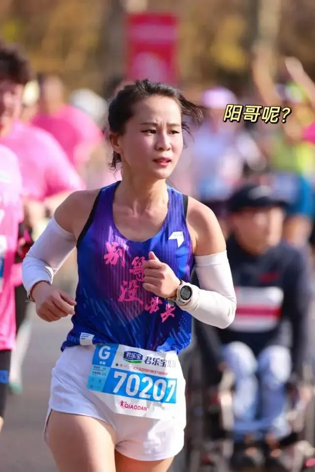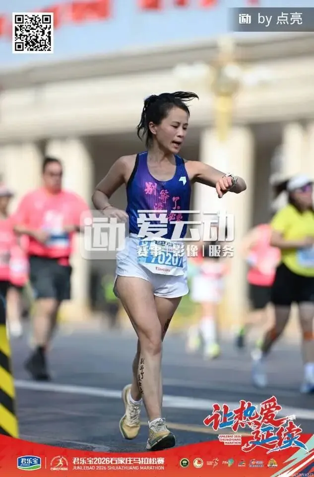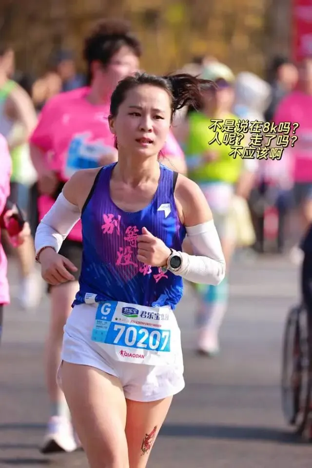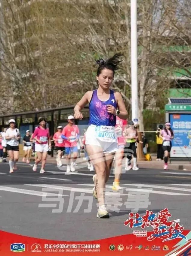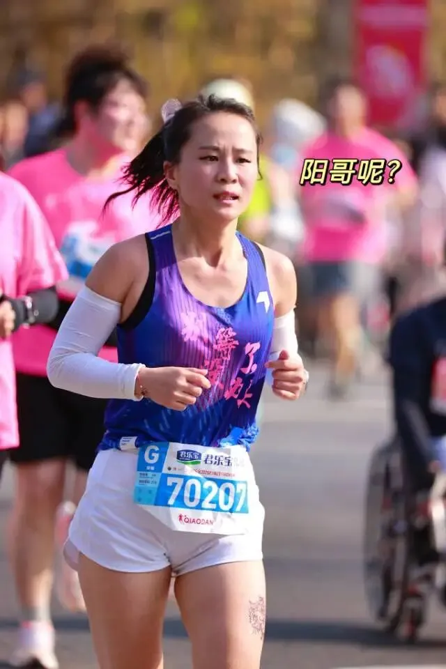毕竟停跑一冬天,上周日又刚跑完安阳半马,28号一大早4点就背着团旗往石家庄赶,为了能跟上团长沈乌贼的活动,下午又跟小伙伴们去景区特种兵式的打卡。开跑就是6分多,我目不斜视心无旁骛的一直往前跑,就是为了早点到阳哥的拍照点位,可不能像去年郑州马拉松2025郑州马拉松一样,让他等我那么久了。快到8K的时候,我就一直左右看,期待能在人群中看到那个熟悉的身影。是的,阳哥早就看到我了,阳哥不语,只是默默的按快门,才有了赛道上这么真实的影像记录。放上他的生活照,大家在赛道上看到的时候大喊一声:我是18的朋友,阳哥就会咔咔咔咔·····照片多到数不完!没有跑量堆积的马拉松是痛苦的,告别了阳哥,折返后,太阳渐渐热烈起来了,如同赛道两边热情的观众,热烈又热情。我的表情也从风轻云淡逐渐变得面目狰狞,腿不是累,是沉,沉到抬不起来,每一步都像踩在棉花上又裹着铅。脑子里的两个小人儿又在打架了:别跑了,走路也能到终点 VS 我还能跑两步儿······这时想起来墨镜唯一的好处就是看不到你的痛苦面具,多希望这时候能有一个魔法眼镜啊,这样你们就看不到我有多狼狈了······纠结着,挣扎着,跑着······猛一抬头,看到这个分流牌,我又支棱起来了。哈哈,马上下班了!最后几步了,跑快点儿就能早下班。边对自己说着,边默默提了速跑起来,顺带开心的发了个朋友圈。你们的凯姐催我了,我得加油干了!三下五除二,冲线!下班的感觉真好!